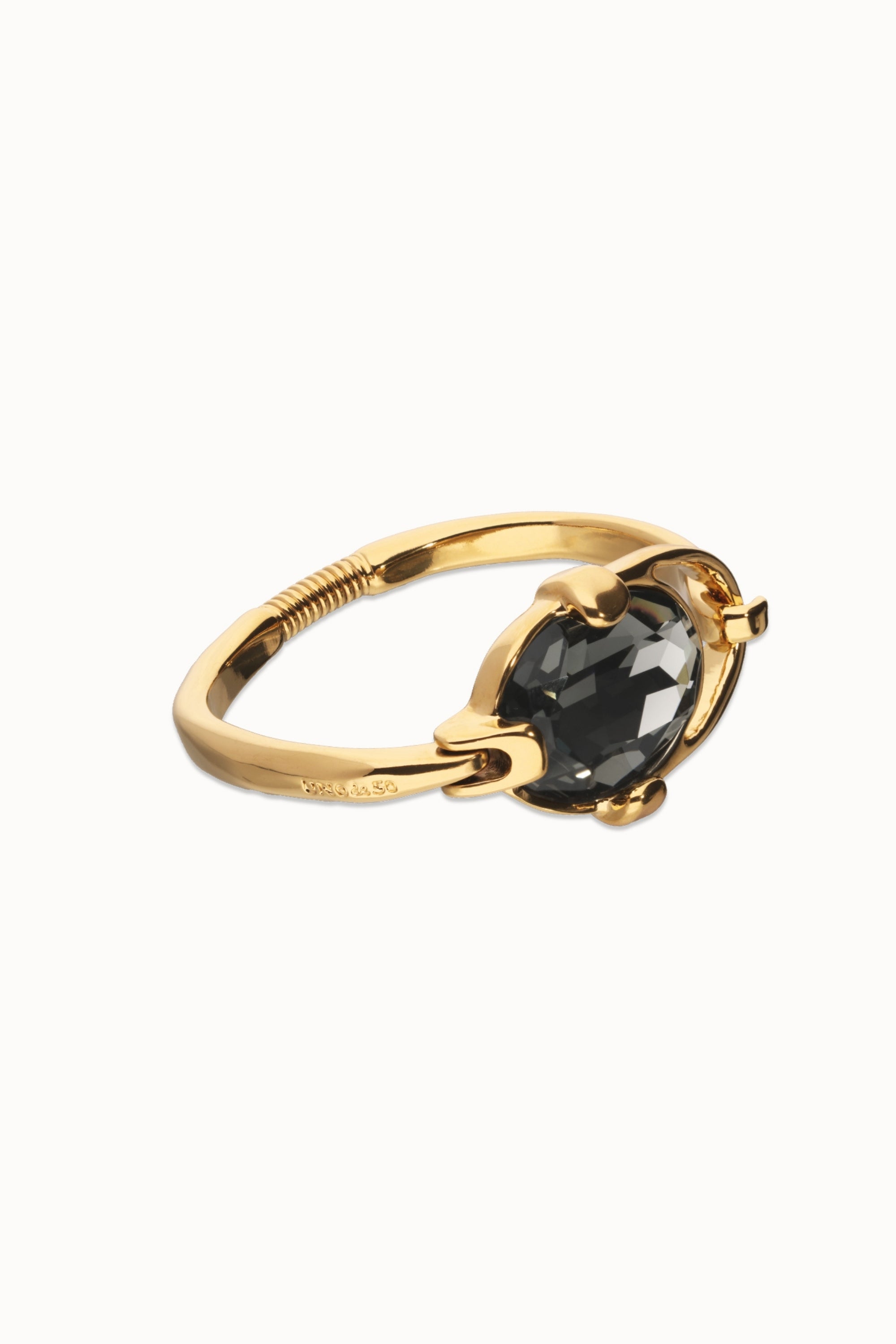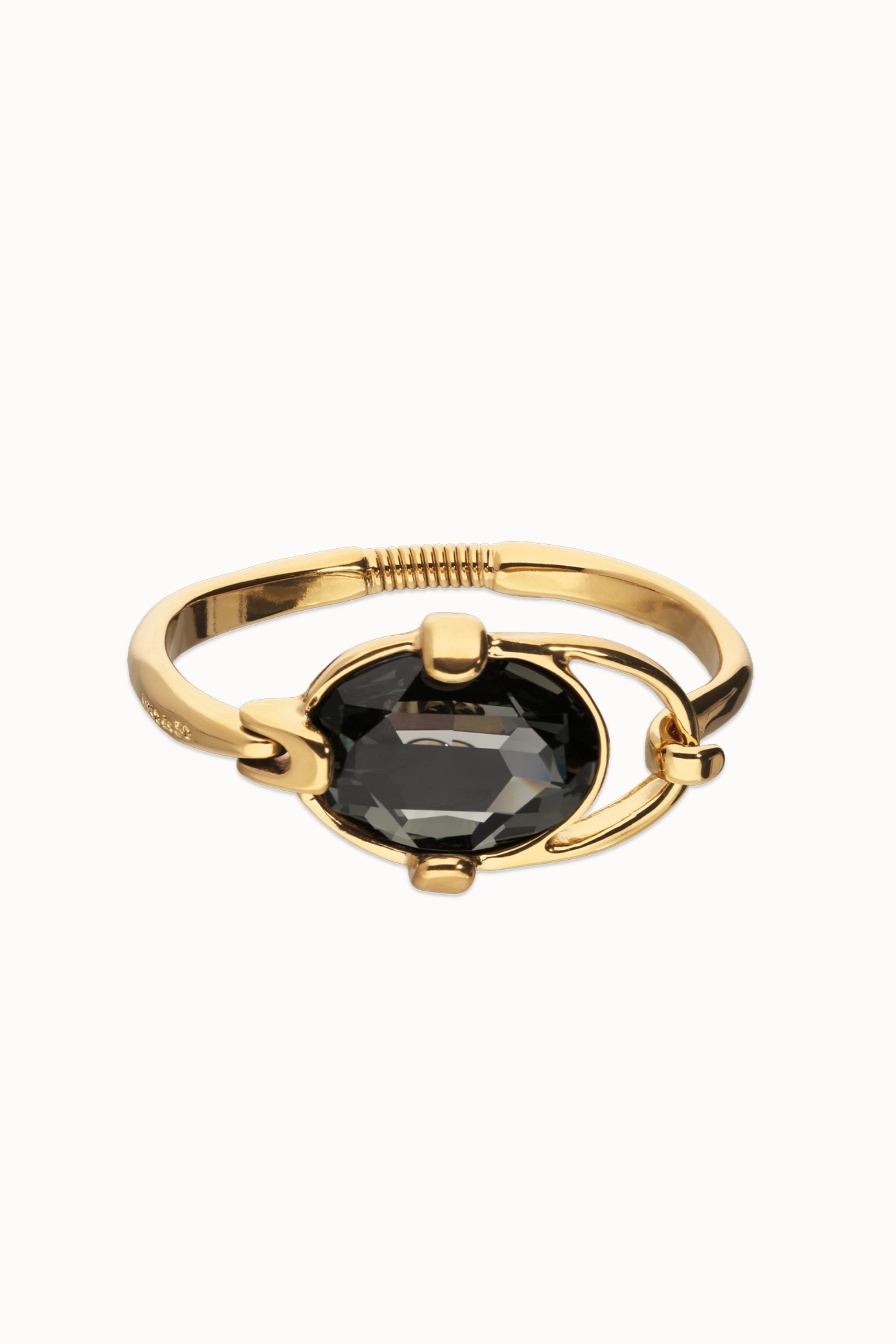 This designer bangle is an ode to duality: the warm, robust structure frames an elegant faceted crystal in a deep graphite gray tone.
