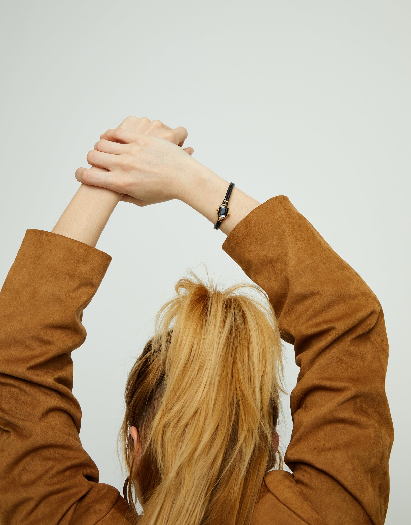 This unique piece of jewelry fuses a double brown leather strap, which adds a robust and natural character, with a central element that frames an enigmatic jet black faceted crystal.