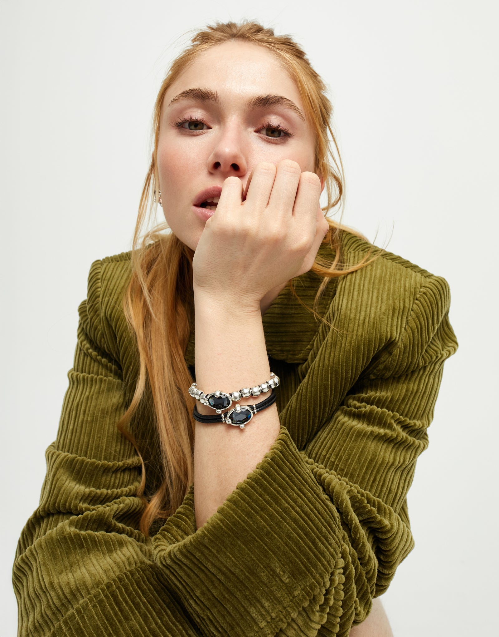 The bracelet symbolizes the fusion between the robust and the subtle, where the coldness of the metal frames the elegance of the dark crystal.