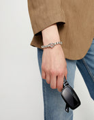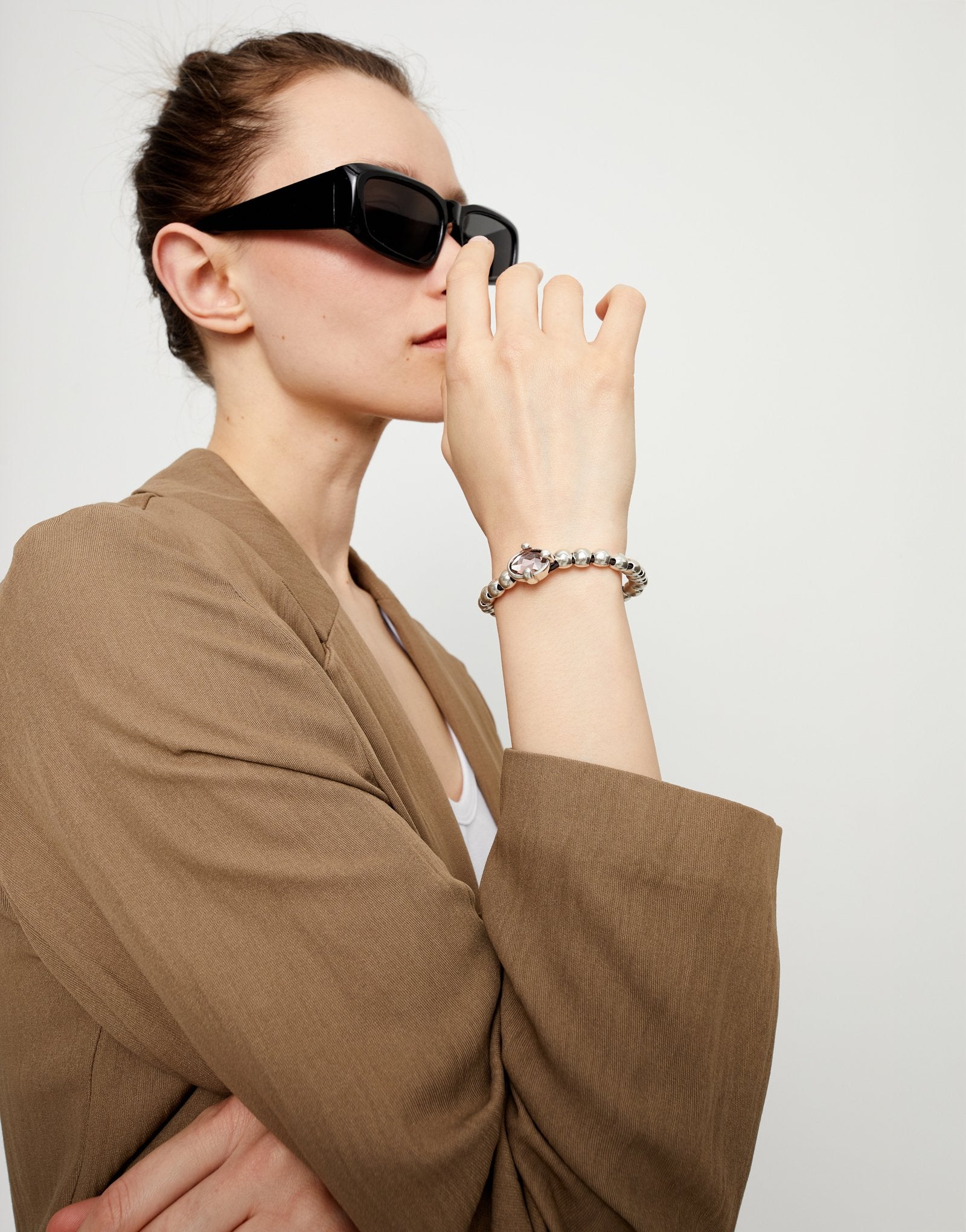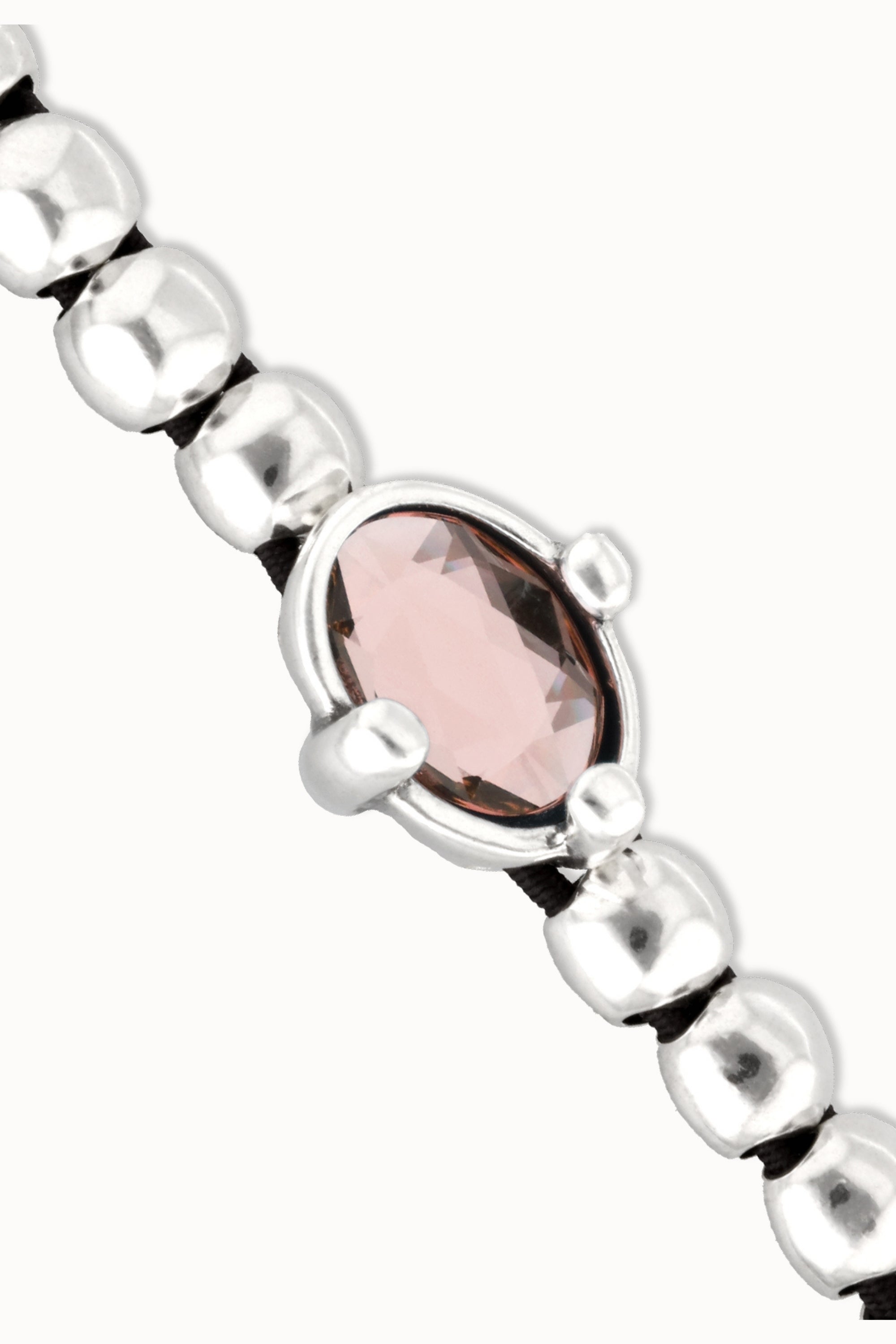 The bracelet represents the perfect fusion between the firm and the fragile, where the solidity of the silver enhances the sweet luminosity of the crystal.