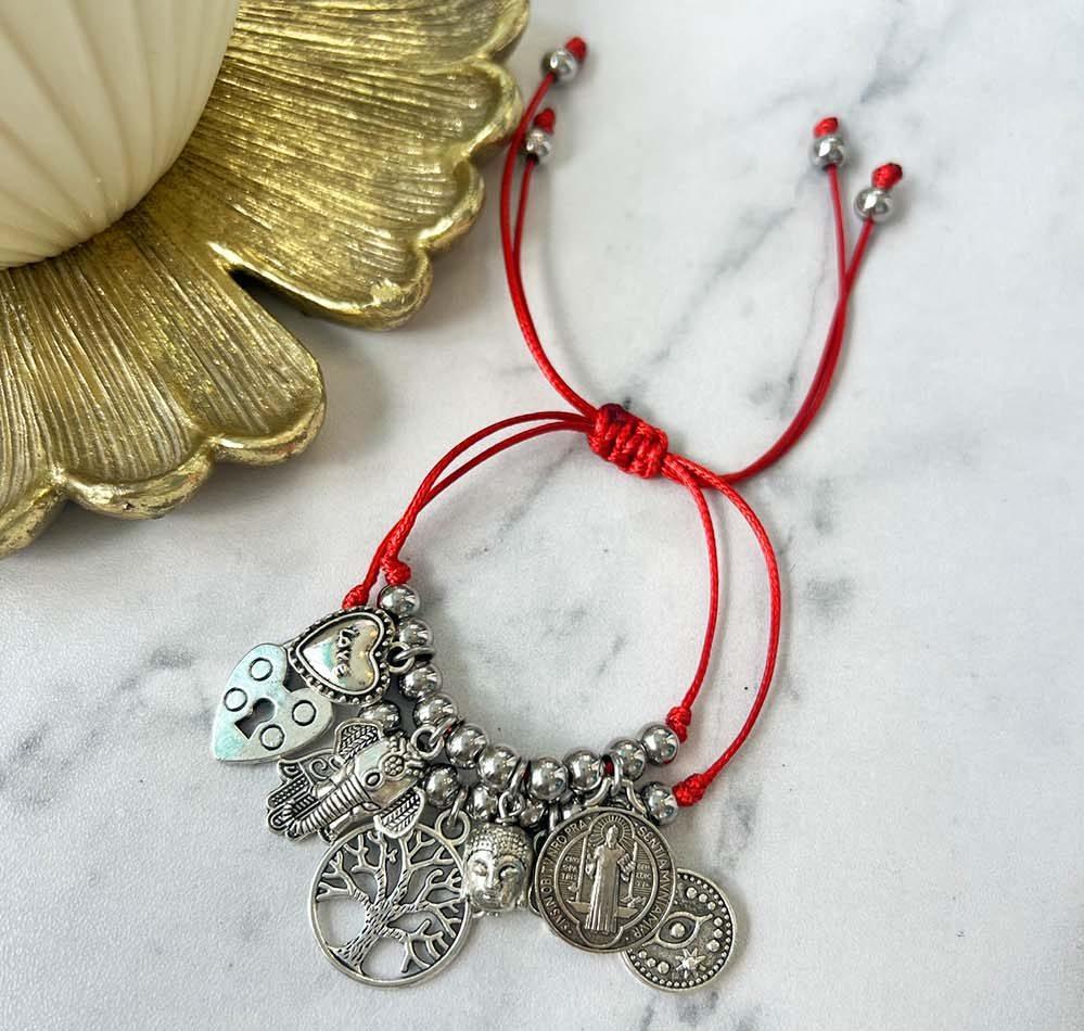 Adjustable bracelet made of smooth cord with nickel-plated silver charms and steel balls.