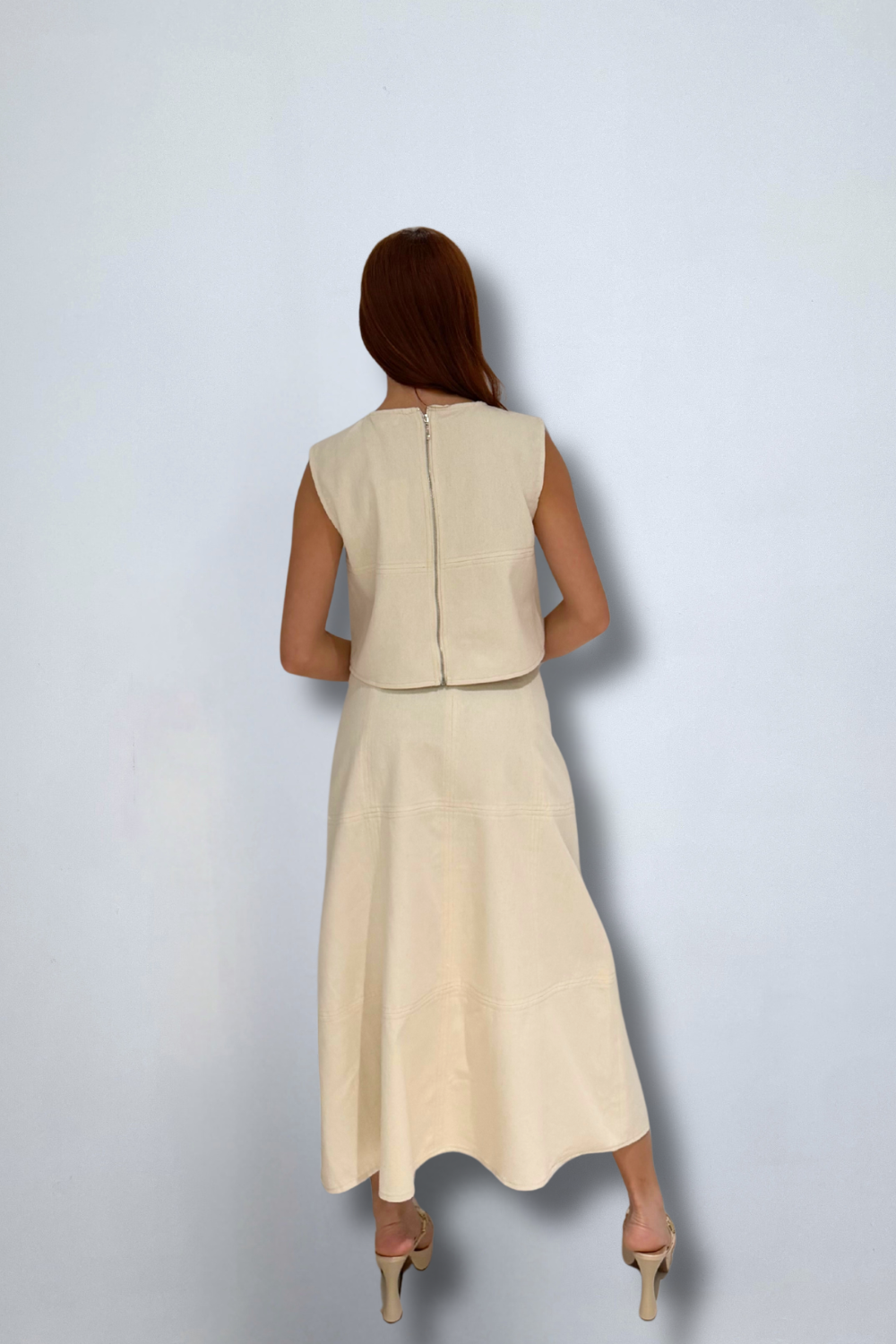 Denim Crop Top W/ Back Zipper & Stitch Detail with Front Zip Midi Skirt W/stitch Detail