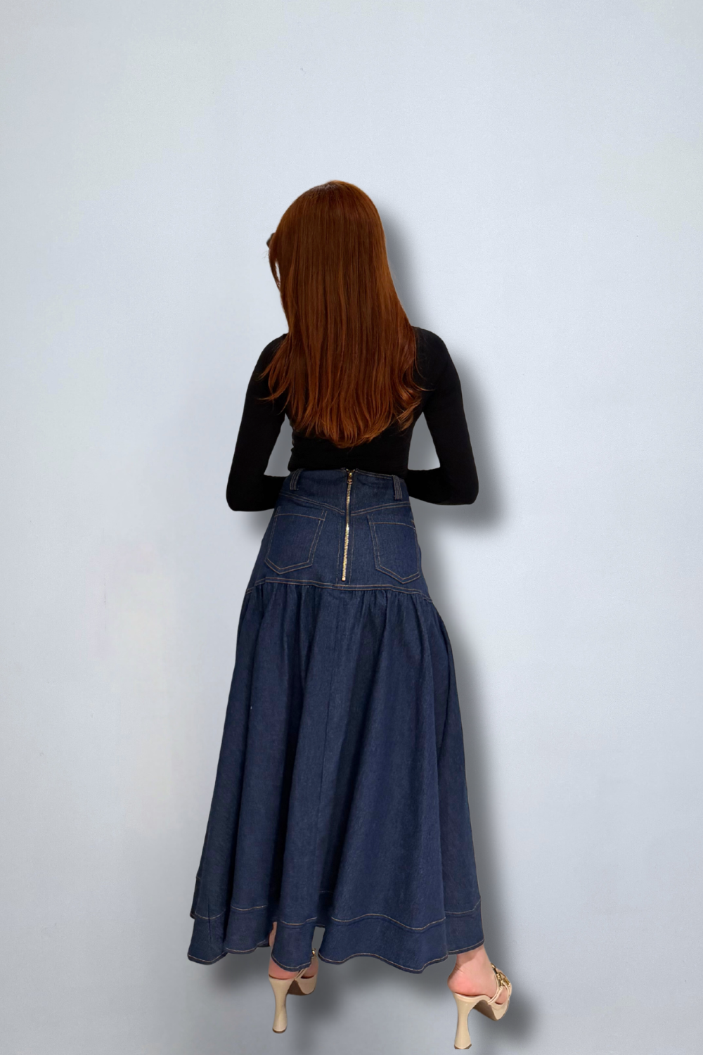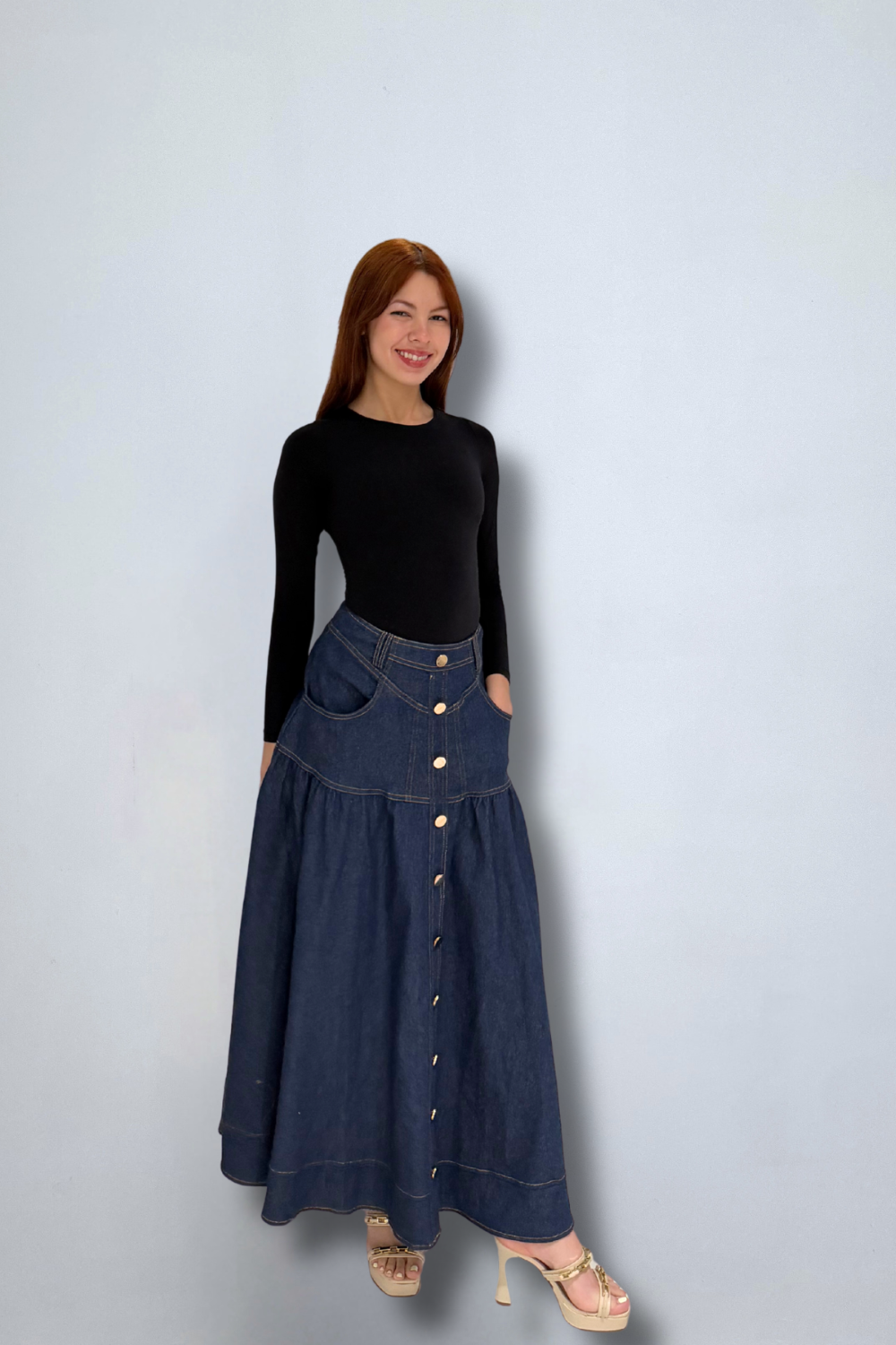 Women woven Solid Denim A-Line Maxi Skirt with button details, side and back pockets