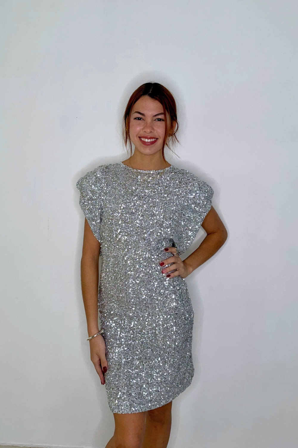 Shimmer and shine in this stunning silver sequin mini dress. Designed with a relaxed silhouette and padded-style shoulders, it offers a modern and effortlessly chic look. The all-over sequins create a dazzling sparkle with every move, making it perfect for holiday parties, special celebrations, or a night out.