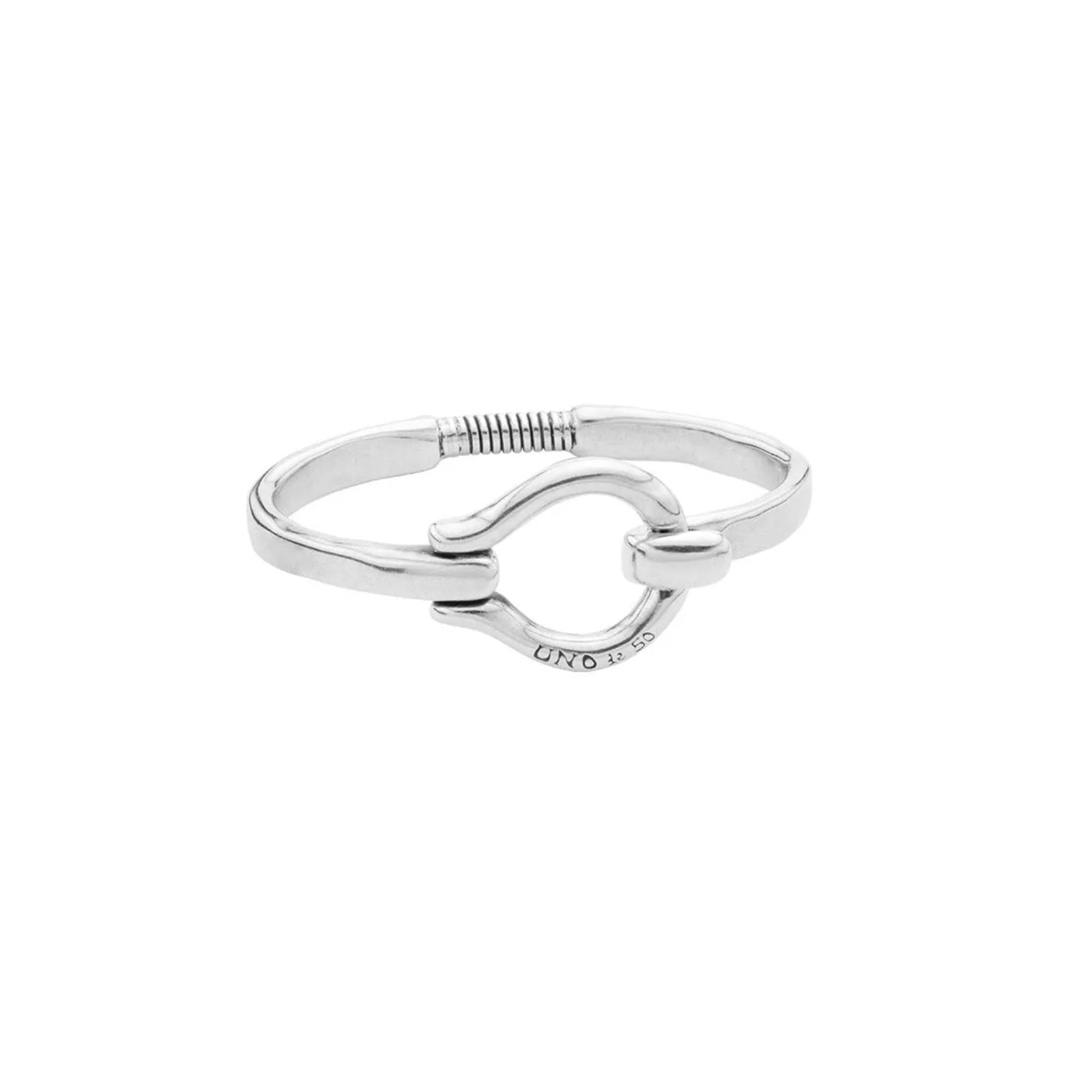Original pulsera rígida bañada en plata con un cómodo cierre de gancho que luce el diseño exclusivo de la casa UNOde50. Lleva el logotipo de la empresa inscrito y es liso con un pequeño detalle dentado. Déjate llevar por el estilo moderno y único de esta fina pieza elaborada 100% a mano en España. Disponible en diferentes tamaños.