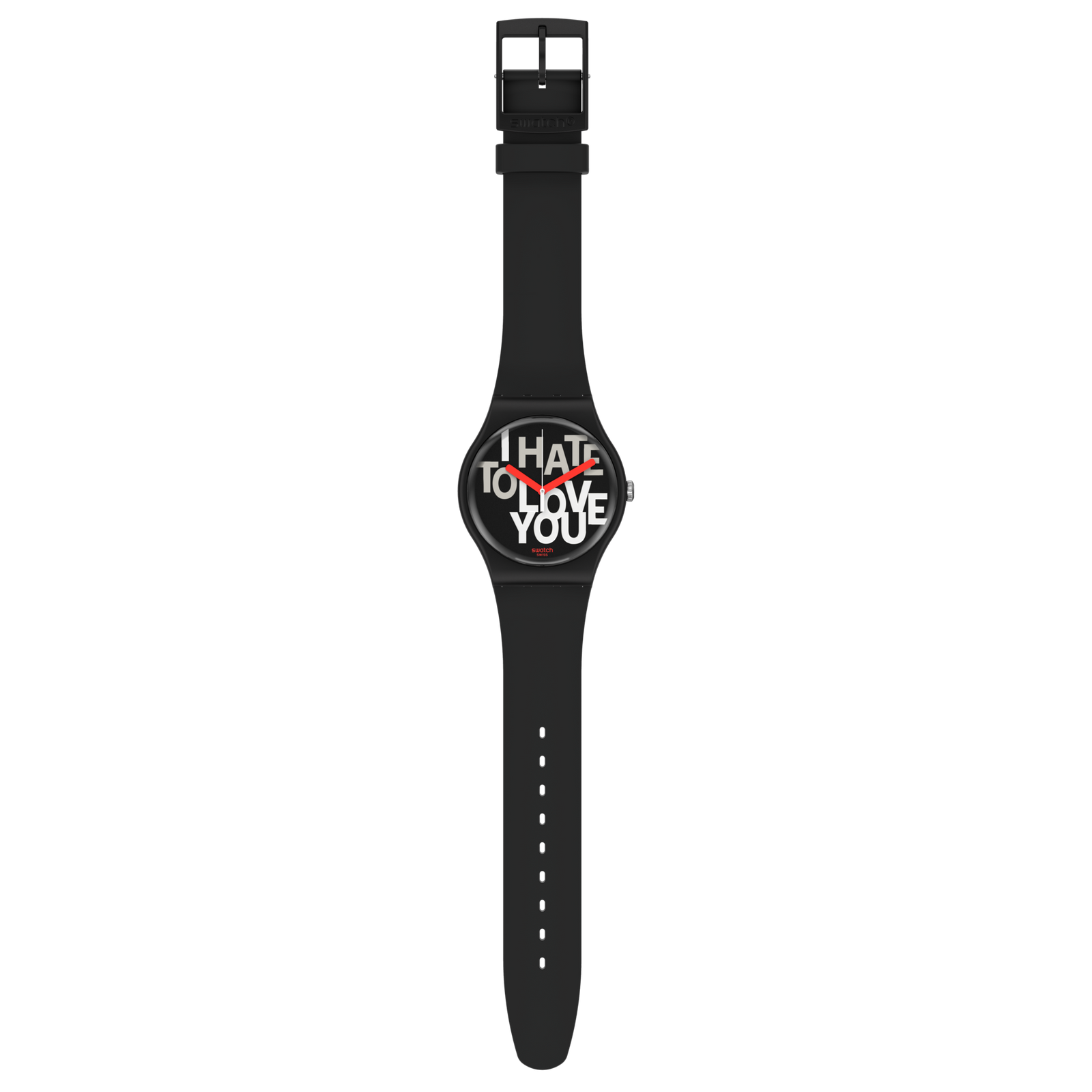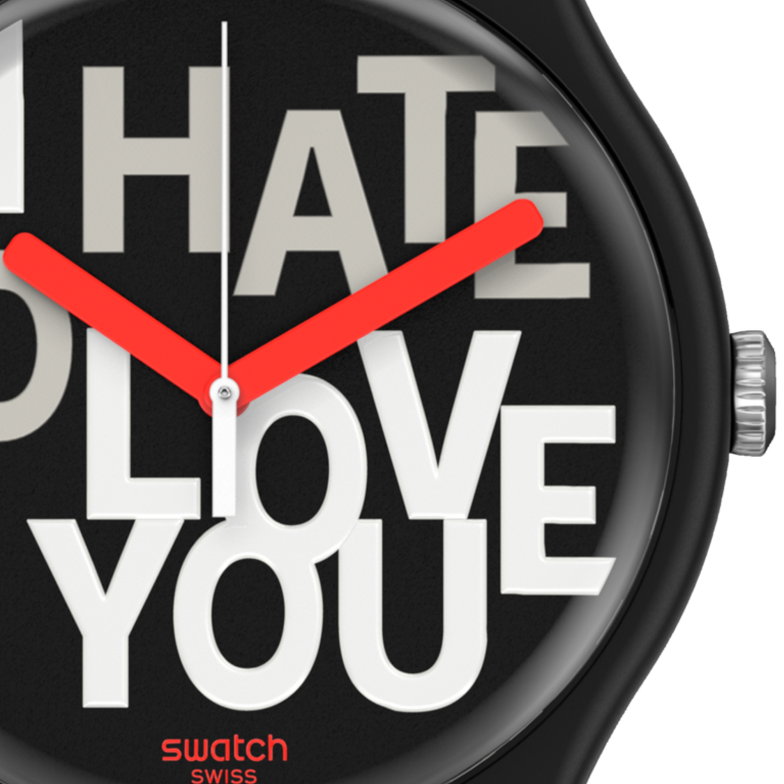 Especial San Valentín. ¡Yo odio amarte! Pero te encantará tenerlo. Al igual que la emoción más compleja del mundo, HATE 2 LOVE (SUOB185) también tiene más de una cara. Durante el día, el reloj de silicona de color negro intenso grita “ODIO AMARTE”. Por la noche, cuando la mente está sobrecargada de pensamientos, las palabras "TE AMO" brillan y aportan algo de claridad al dial. Y tal vez tu corazón. ¡YO TAMBIÉN TE AMO!