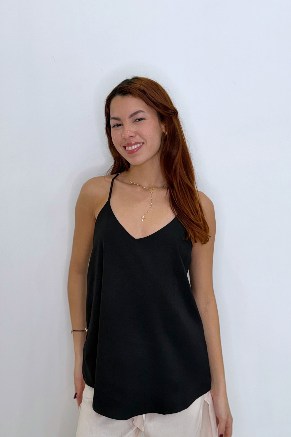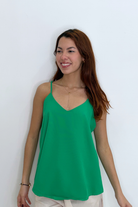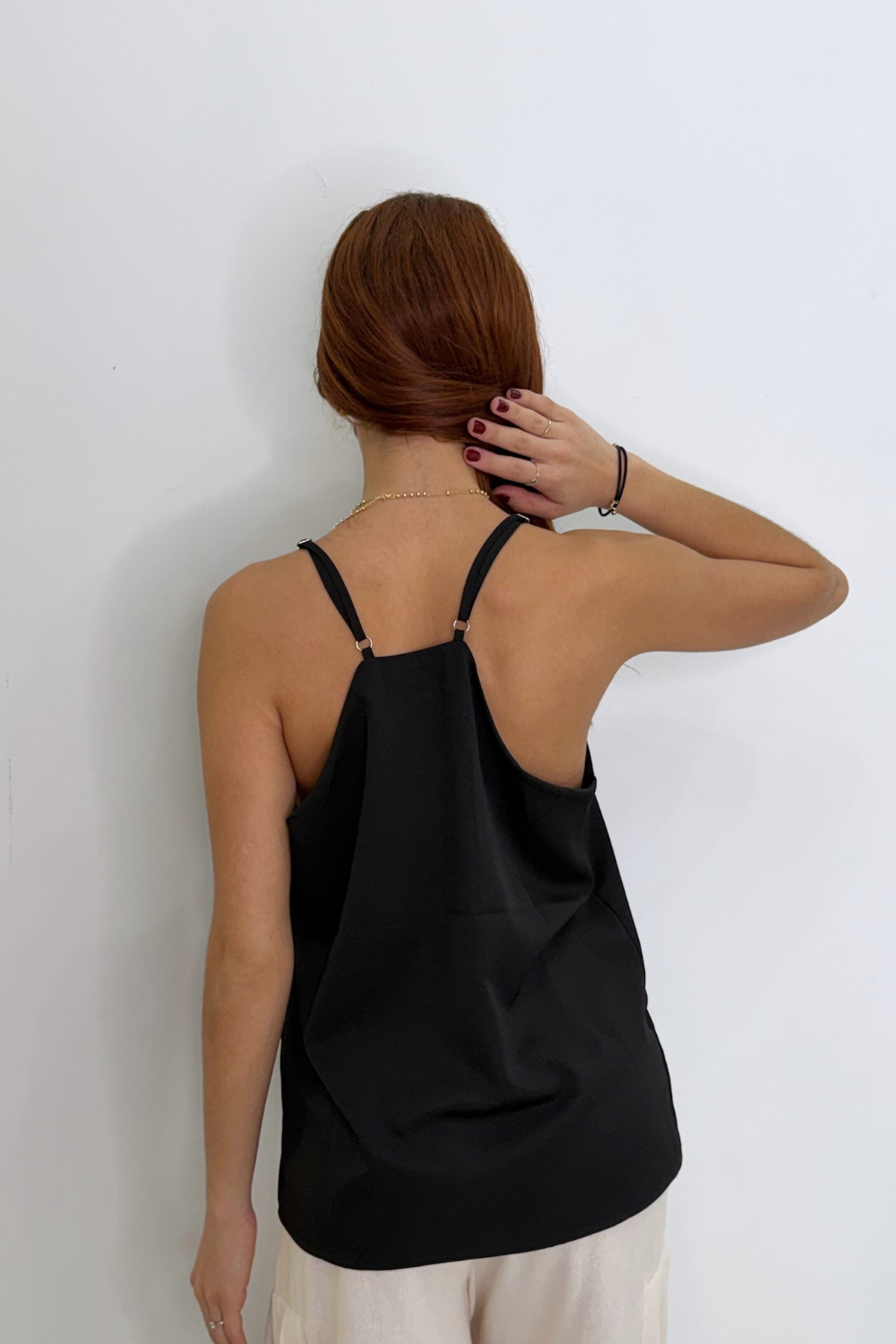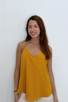 The top has a relaxed, flowy fit that drapes smoothly over the body, giving it an elegant yet casual look.