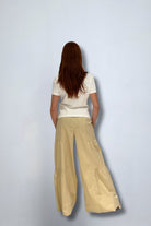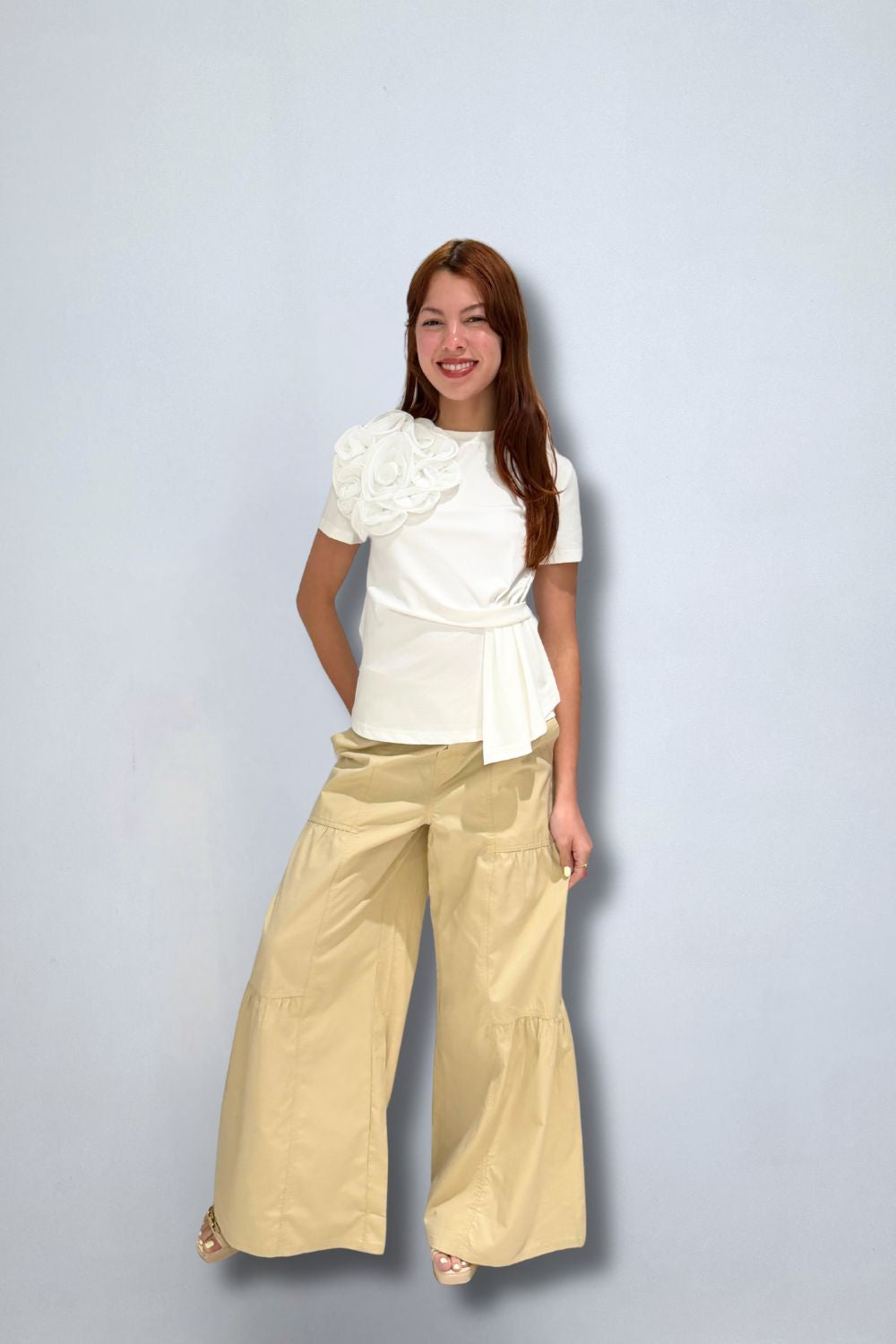• Wide leg palazzo silhouette with flare hem