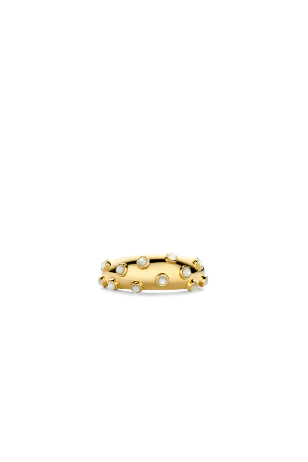 El anillo abovedado Milano de plata bañada en oro 12251MW hace alarde de dobletes de nácar dispersos en la parte superior de su banda. El anillo está elaborado en plata de ley 925. Este diseño vintage redescubierto es una pieza opulenta y atemporal. Úselo solo o combínelo con otros, no dejará de llamar la atención.