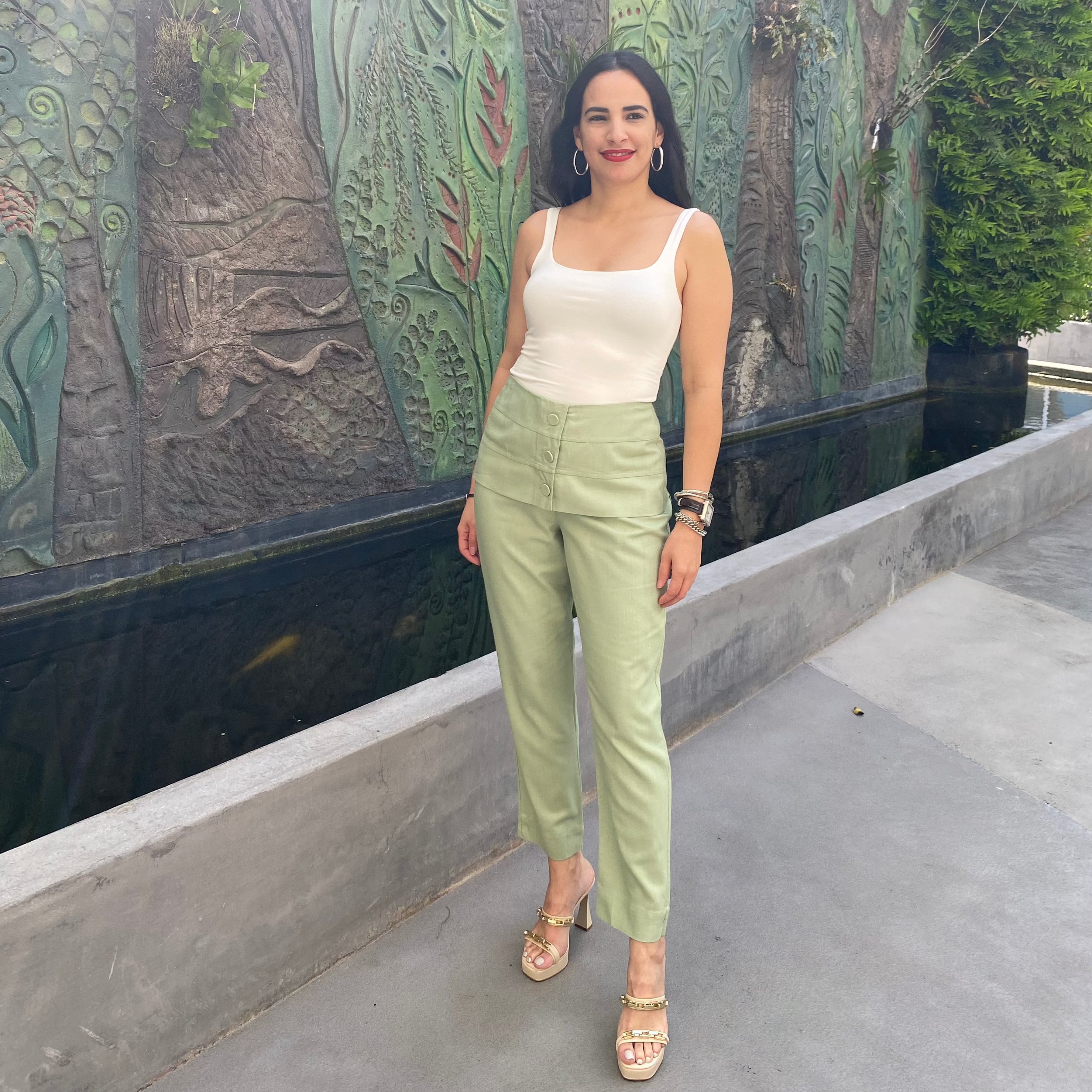 A classic with bossa. Our linen pants have a high waist, a wide yoke with buttons, a straight fit with an adjusted hem and a cropped length.