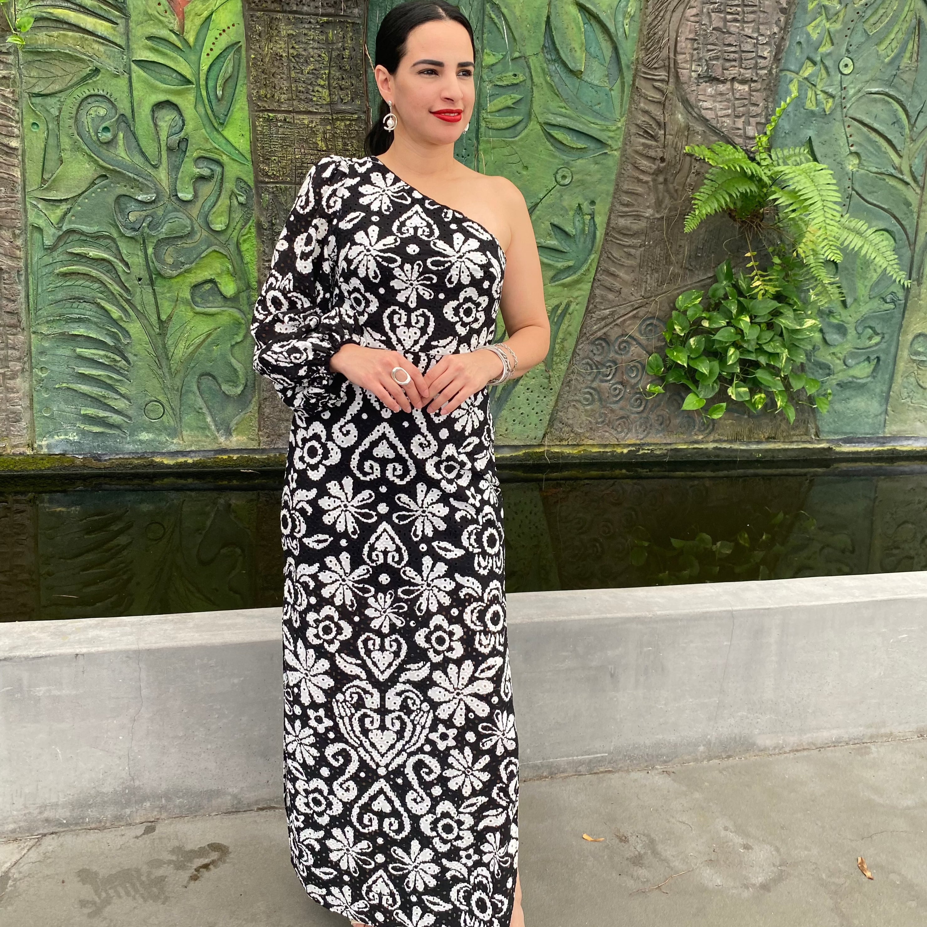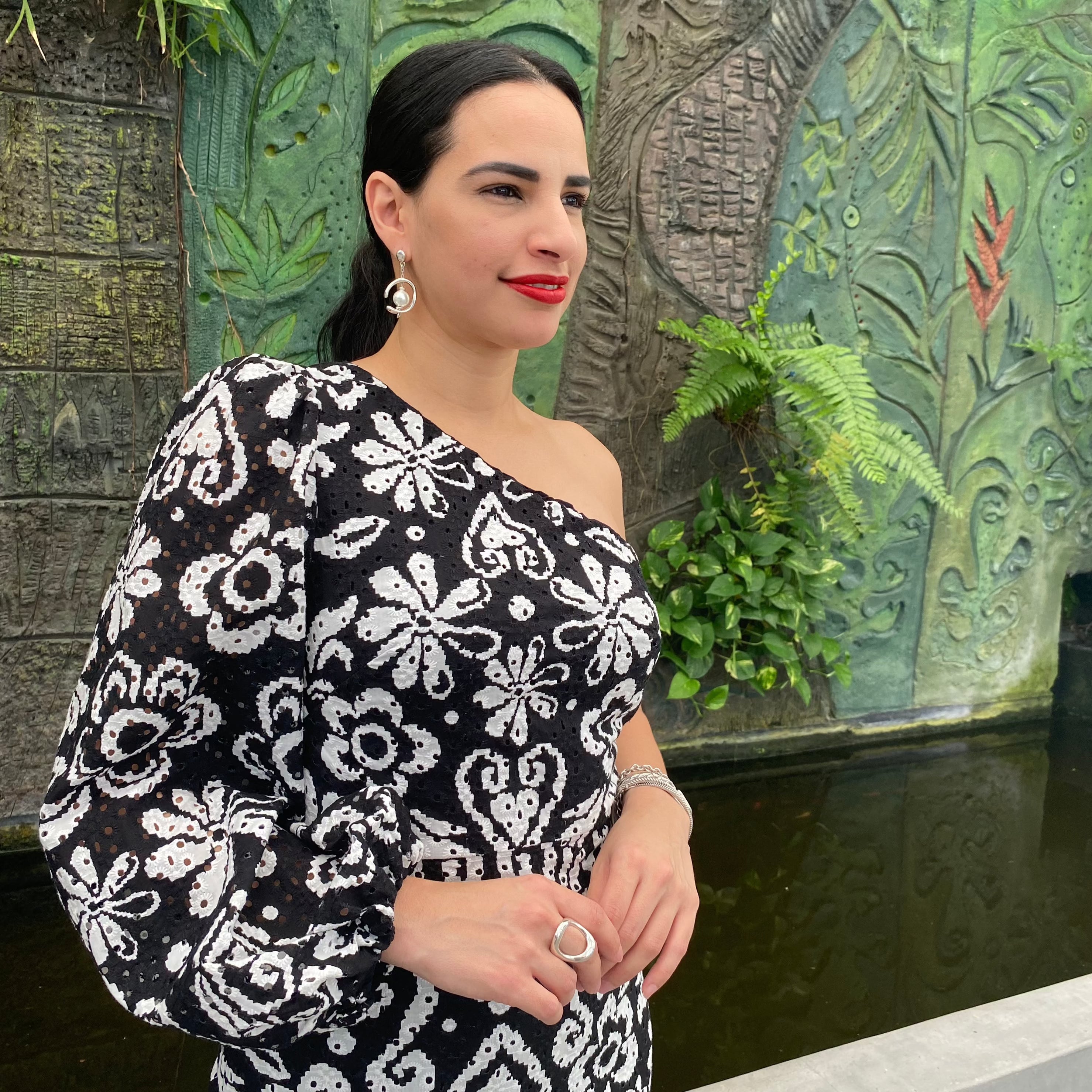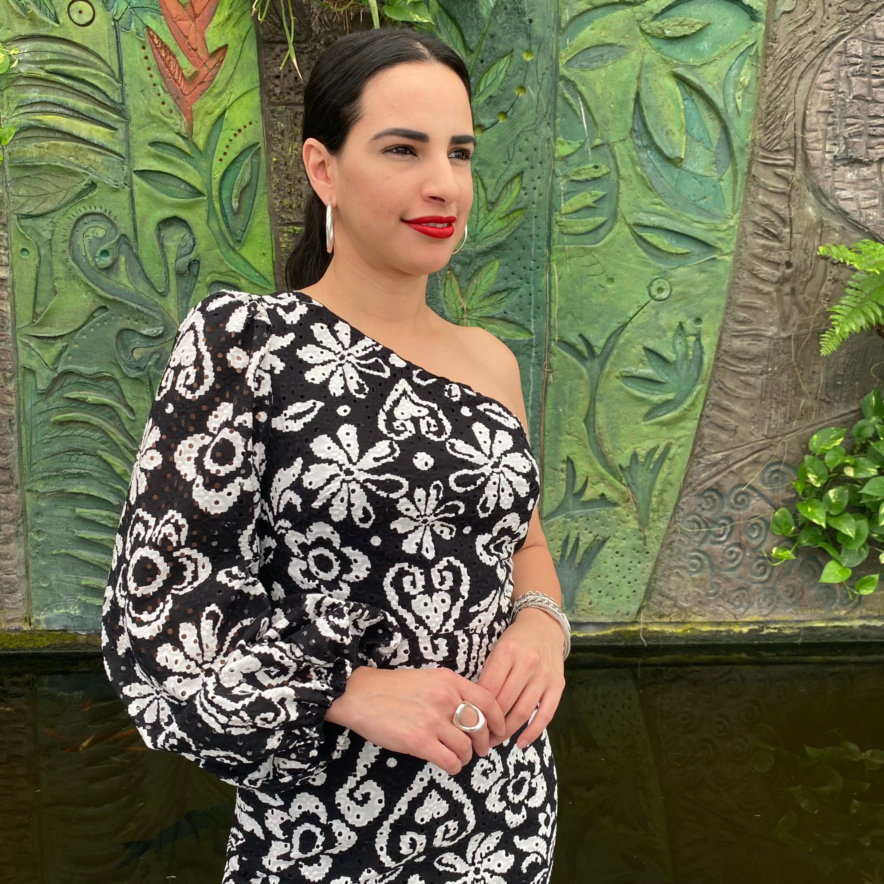 A super special piece from our Collection. Our laise dress in the Afeto print has one shoulder with long puffed sleeves, fitted to the body with a defined waist and side slit.