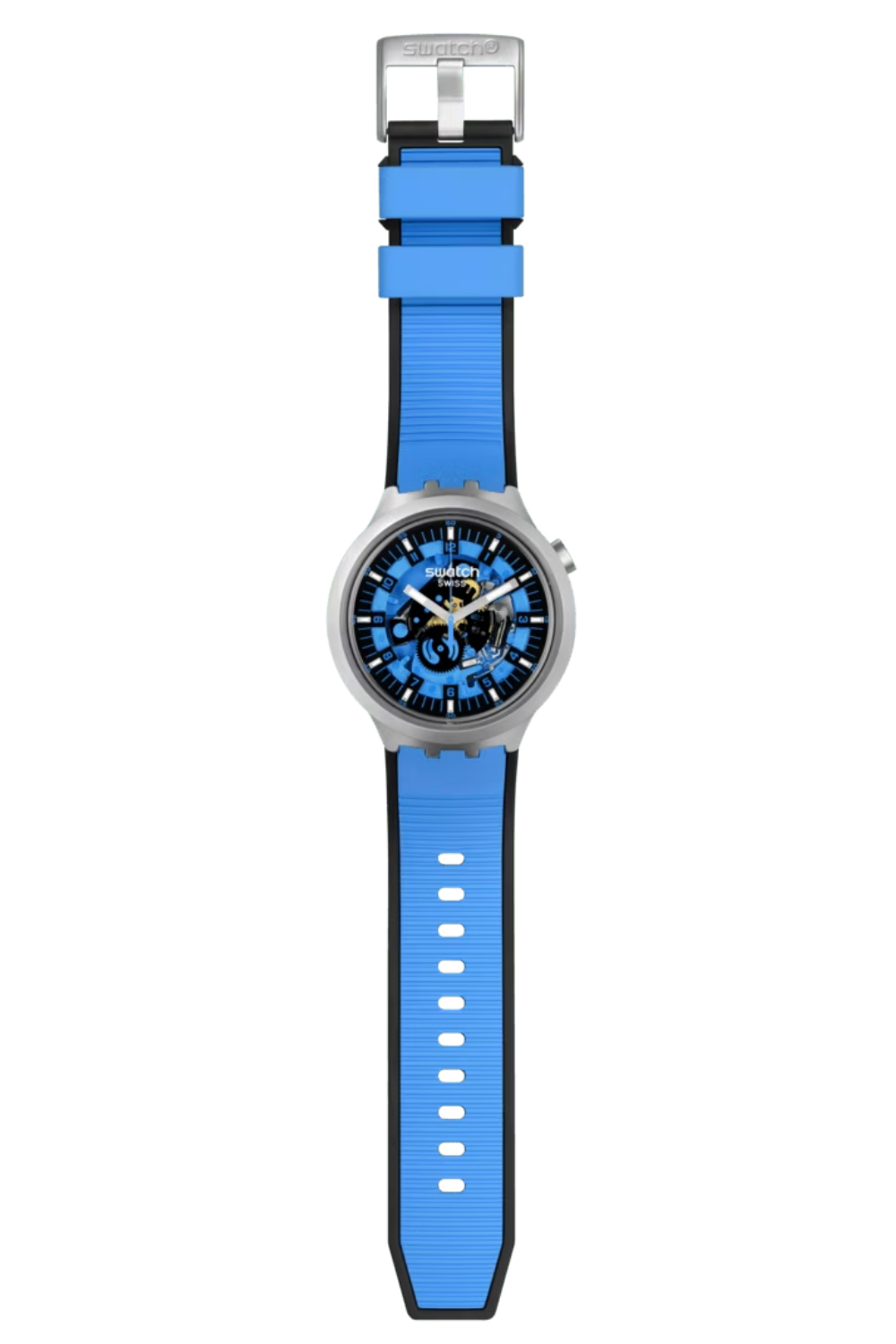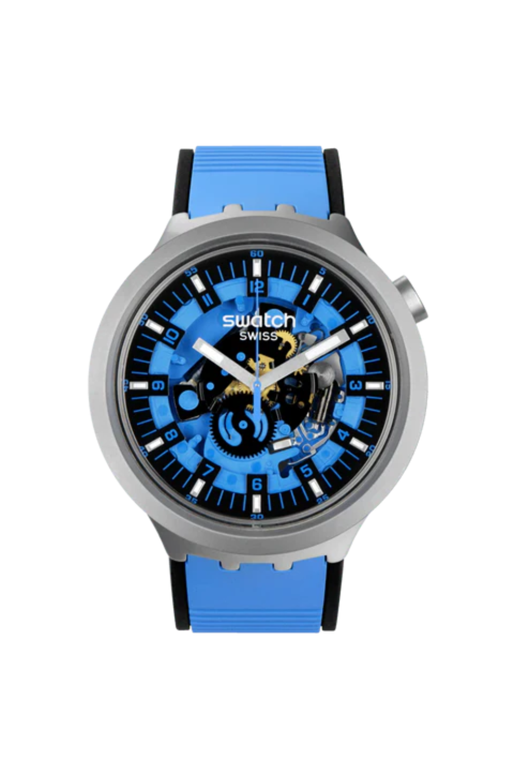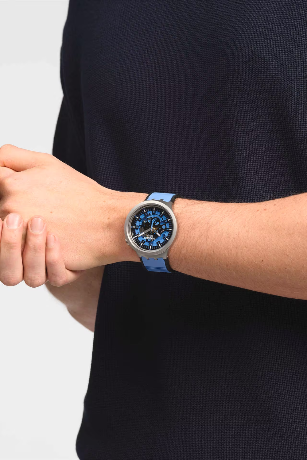 Este reloj de gran tamaño presenta una esfera abierta negra con manecillas que brillan en la oscuridad en una caja de metal arenado. Un reloj azul de esfera grande, luce una correa estructurada duradera y dos presillas.