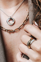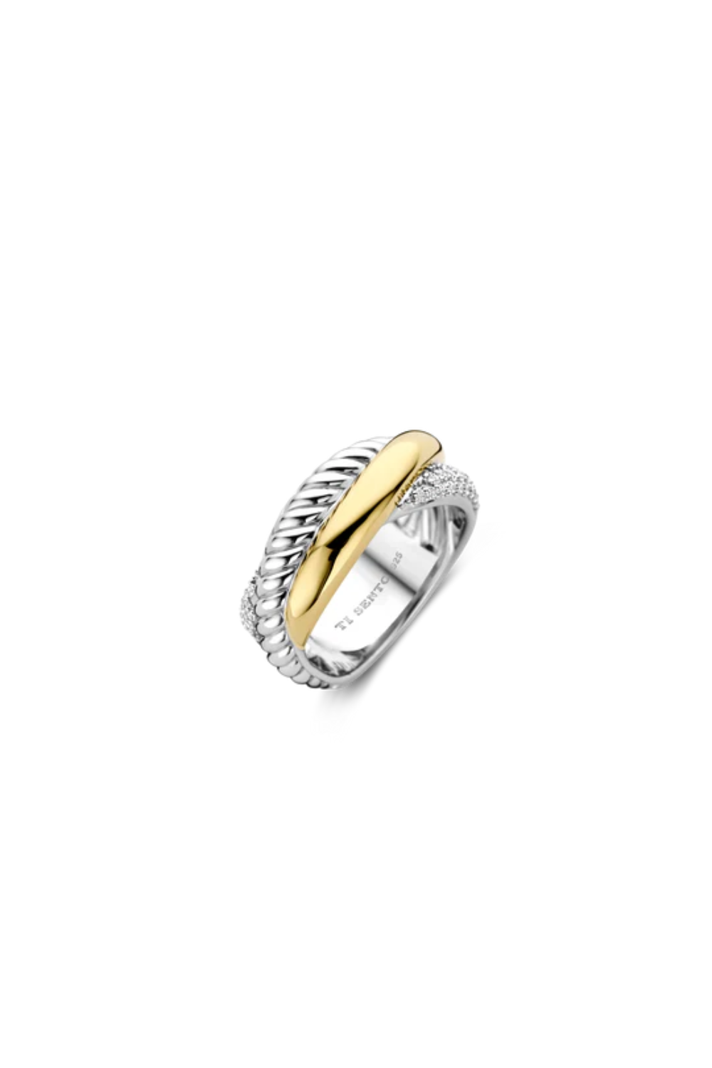 Indulge in the captivating interplay of textures and metals with this TI SENTO gold-plated silver Ring 1973ZY. This bold and sculptural piece features three intertwined bands: one is plated in lustrous yellow gold, creating a warm contrast against the cool silver of the other two. Another boasts a twisted design, adding a touch of dynamism, and the third band is adorned with a dazzling pave of white cubic zirconia stones, adding a touch of opulent shine to the piece. Crafted from 925 sterling silver and plated with platinum for lasting brilliance, this ring is a testament to modern luxury. Its intricate design and striking combination of materials make it a true statement piece. Add that oomph to your everyday look with this audacious accessory. Crafted with care for sensitive skin, this nickel-free and hypoallergenic ring ensures lasting comfort and quality.