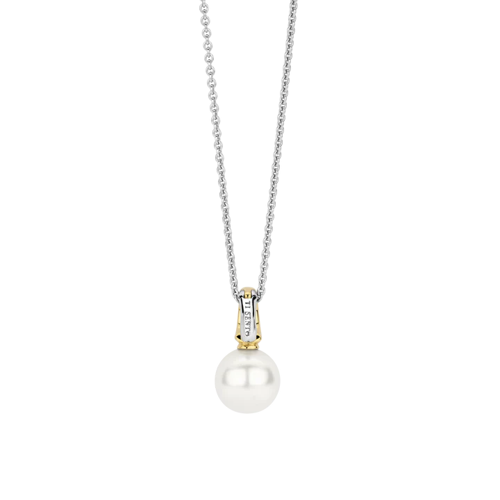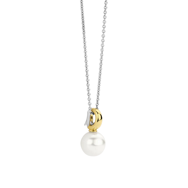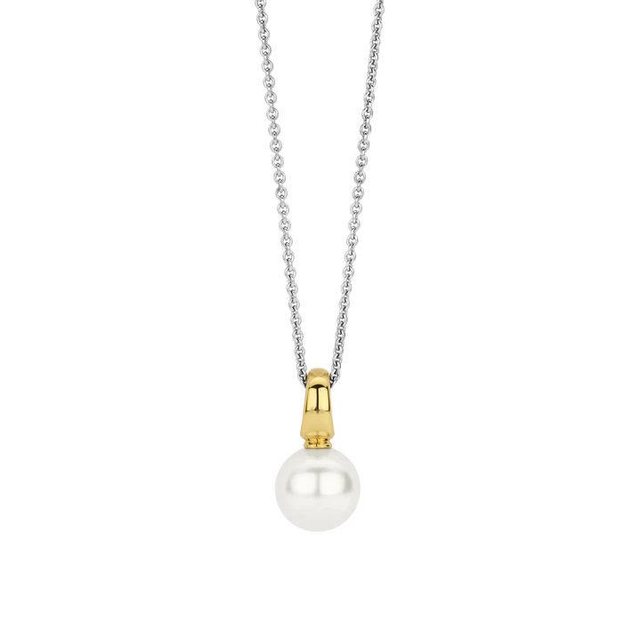 Indulge in the ethereal beauty of this TI SENTO gold-plated Pearl Pendant 6835YP. Crafted from 925 sterling silver and plated in lustrous yellow gold, this pendant features a captivating round pearl with a unique fantasy cut. The pearl's irregular shape adds a touch of whimsy and individuality to the design. Pearls merge vintage allure with modern sophistication. A symbol of purity and elegance, they have captivated hearts for centuries. This pendant is a modern interpretation of this timeless gem, offering a touch of luxury and sophistication. Let this pendant be the centrepiece of your refined aesthetic. Wear it alone for a minimalist statement or combined with other TI SENTO necklaces for a personalised touch that exudes effortless chic. Crafted with care for sensitive skin, this nickel-free and hypoallergenic ring ensures lasting comfort and quality.