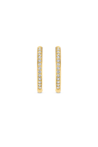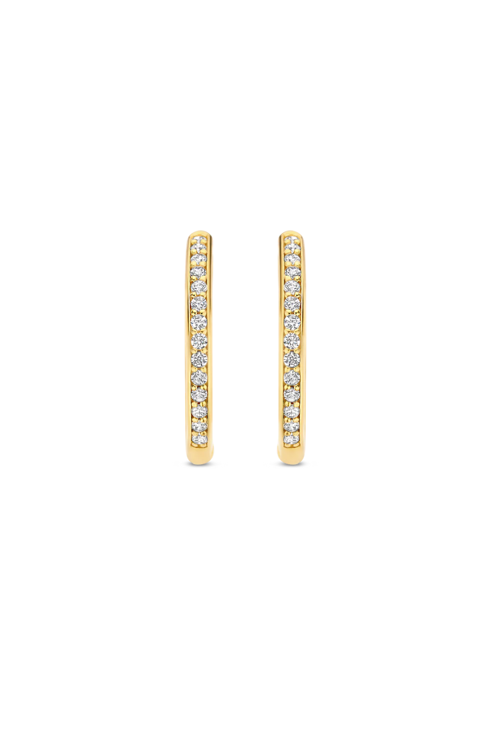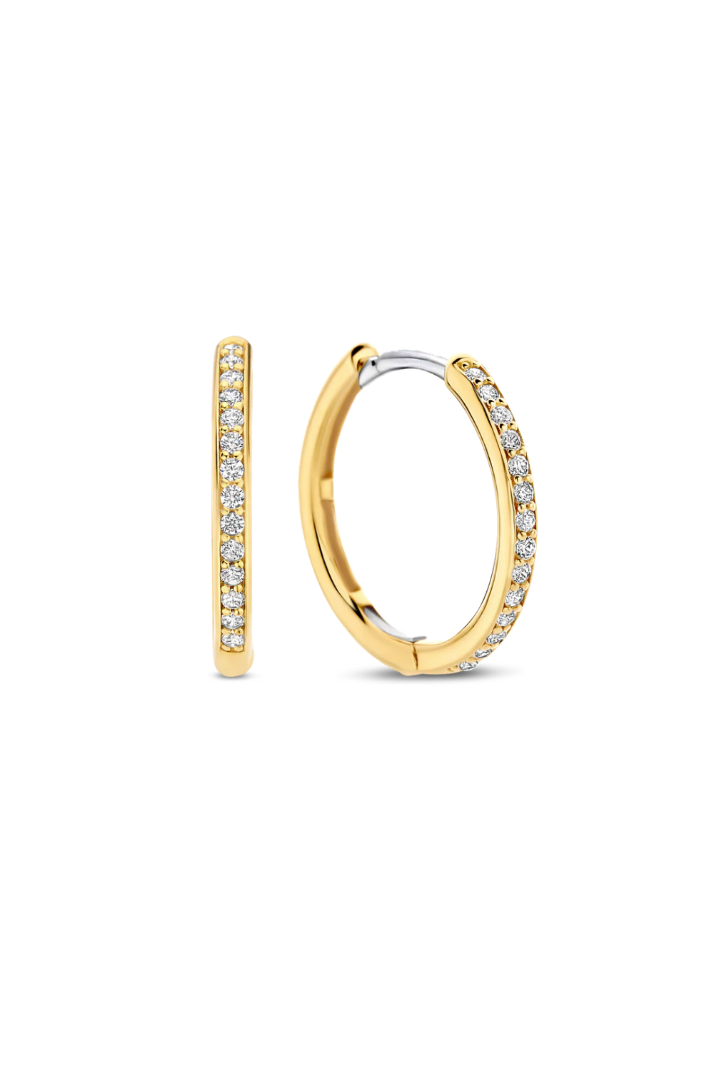 These TI SENTO gold-plated medium hoops 7959ZY adorned with a delicate pave of tiny cubic zirconia stones embody the essence of refined elegance and modern sophistication. Designed with meticulous attention to detail, these earrings will become your new go-to accessory for every occasion. Crafted with precision from premium 925 sterling silver and plated with yellow gold, these hoops boast a delicate 18mm diameter, offering a captivating addition to your jewellery collection. The luxurious gold plating enhances the beauty of these hoops, ensuring they make an eye-catching statement for any occasion. Whether worn solo or paired with other earrings for a sophisticated Ear Party, they are sure to add a touch of sparkle and sophistication to every outfit. Like all our jewellery, these hoops are nickel-free and hypoallergenic, ensuring not just style, but also comfort and quality.