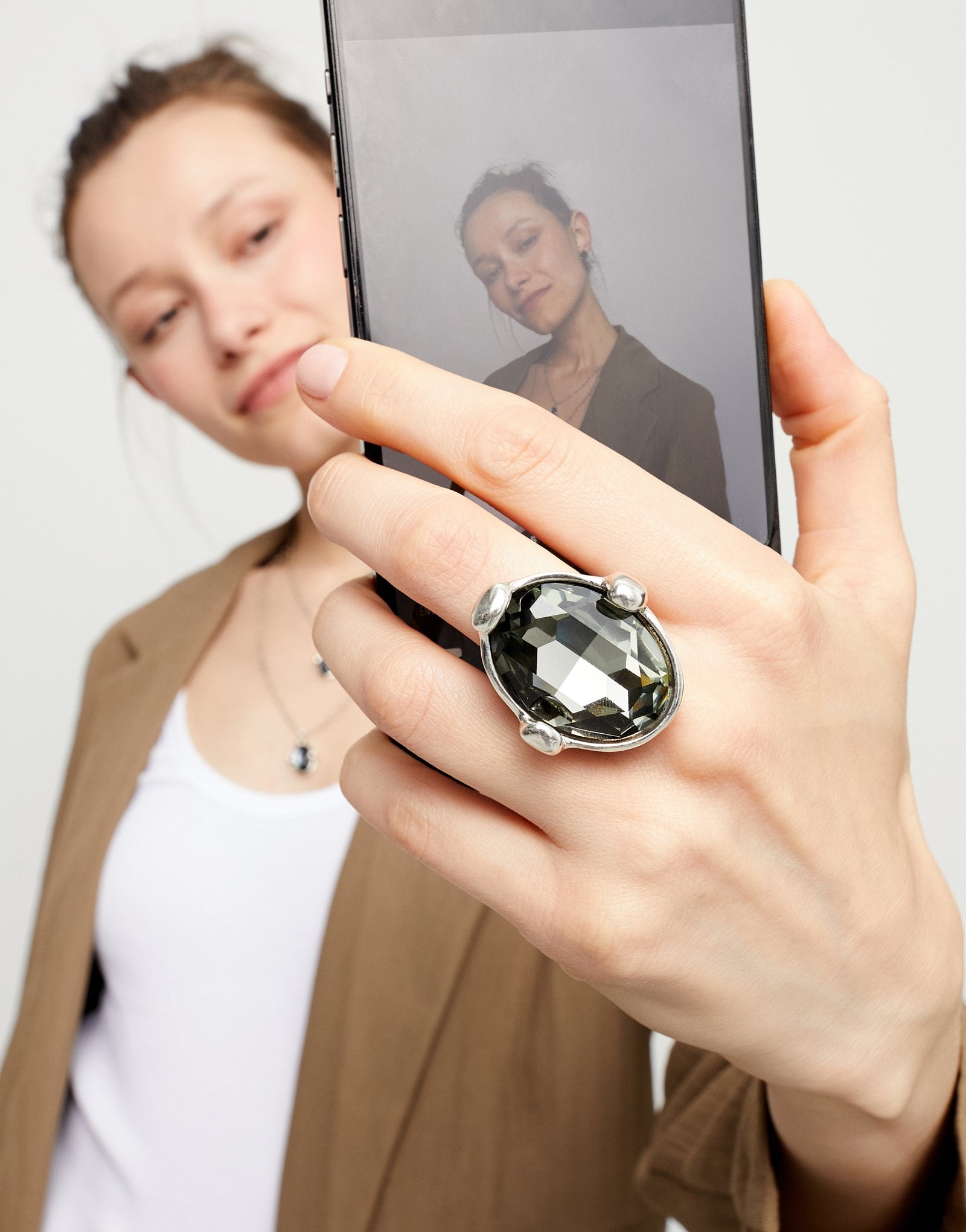 Large ring with gray oval faceted crystal