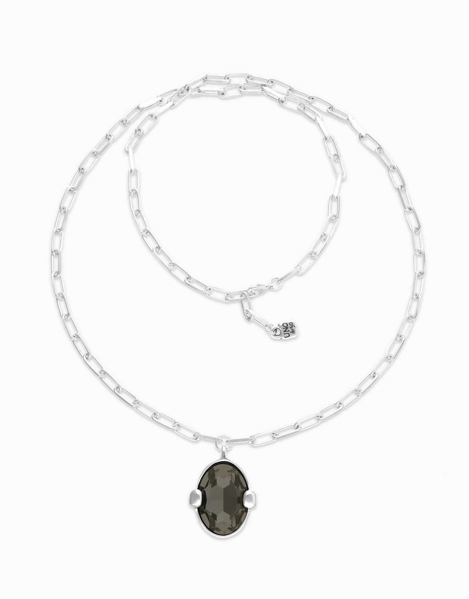 Long necklace with large gray oval faceted crystal