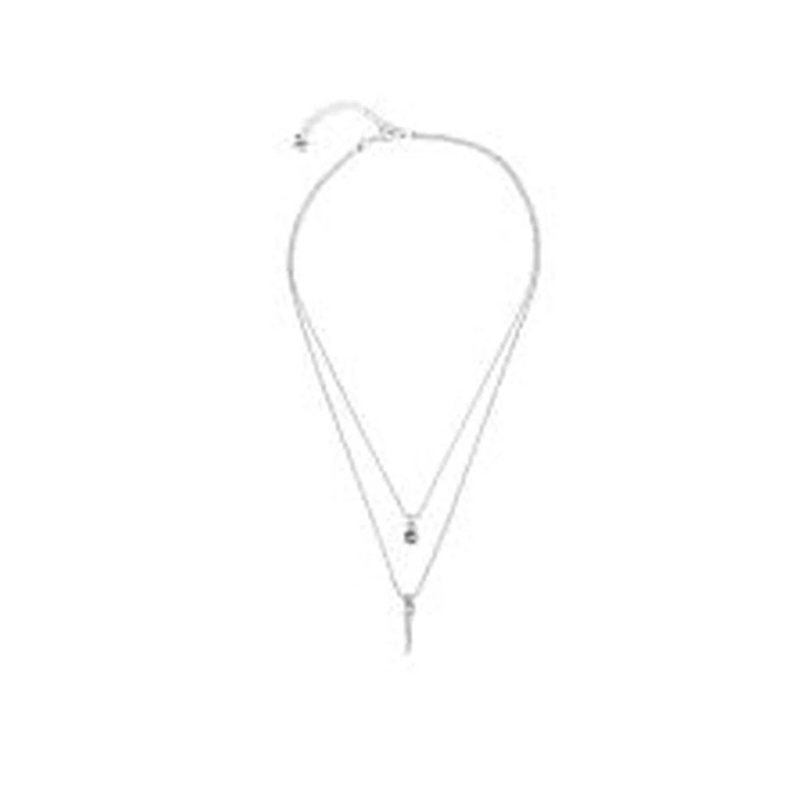 Collar de dos vueltas compuesto por una cadena articulada en metal bañado en plata con dos colgantes, uno en forma de aguja y otro pequeño de botón. Una joya de estilo casual que podrás lucir a diario. Un diseño de UNOde50, fabricado en España y 100% artesanal.