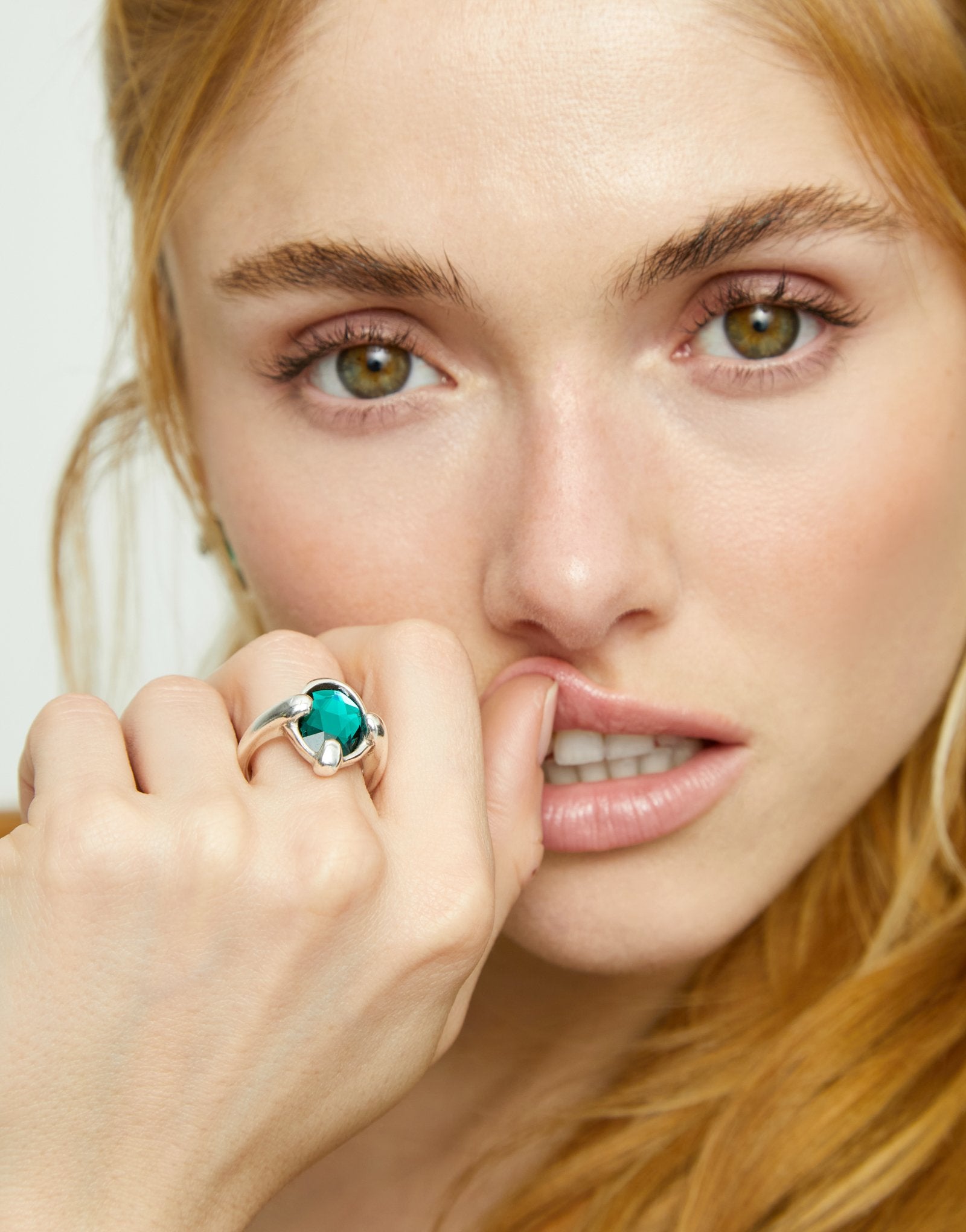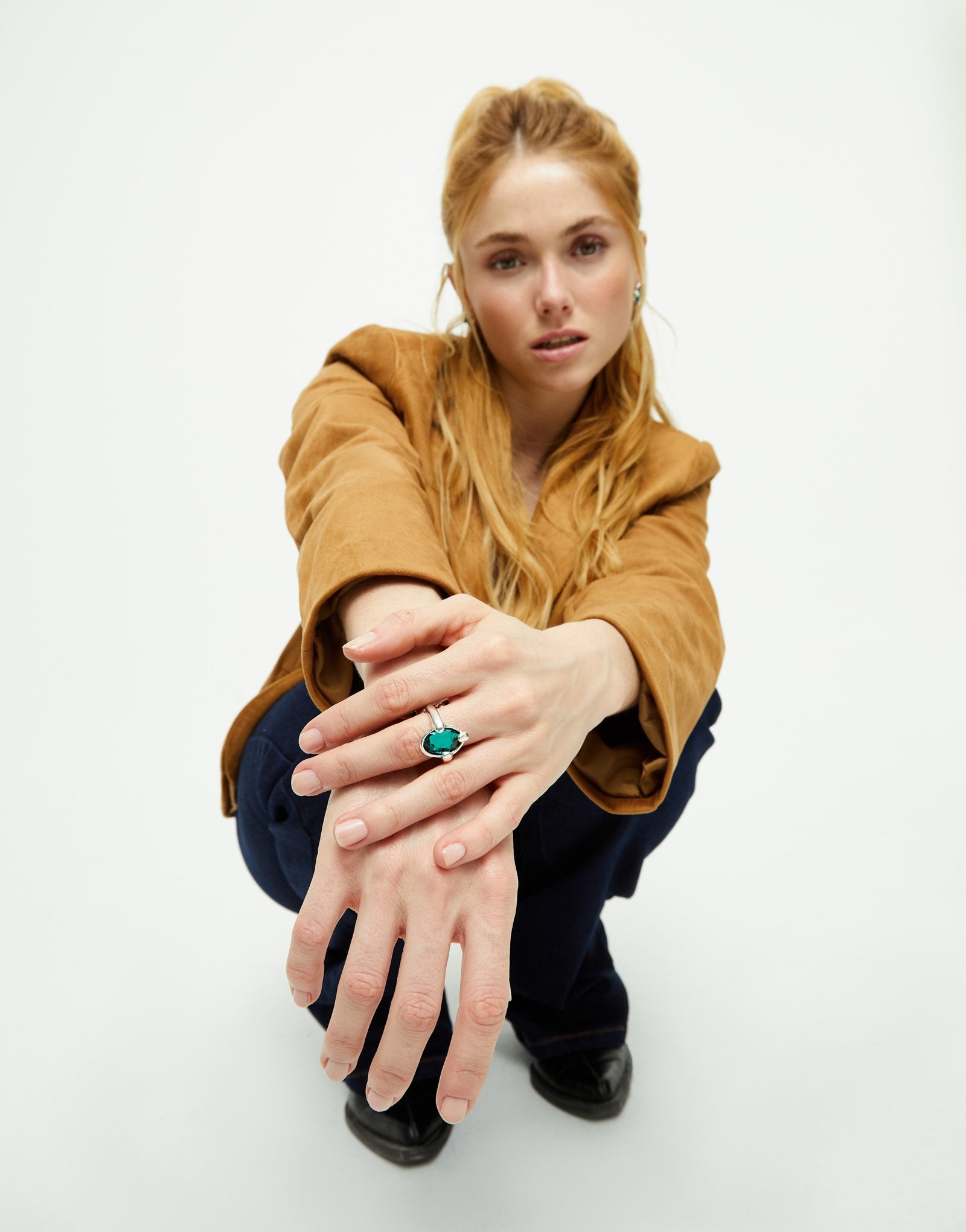 This designer jewelry piece fuses the robustness of its organic form with the deep luminosity of an emerald-toned faceted crystal.