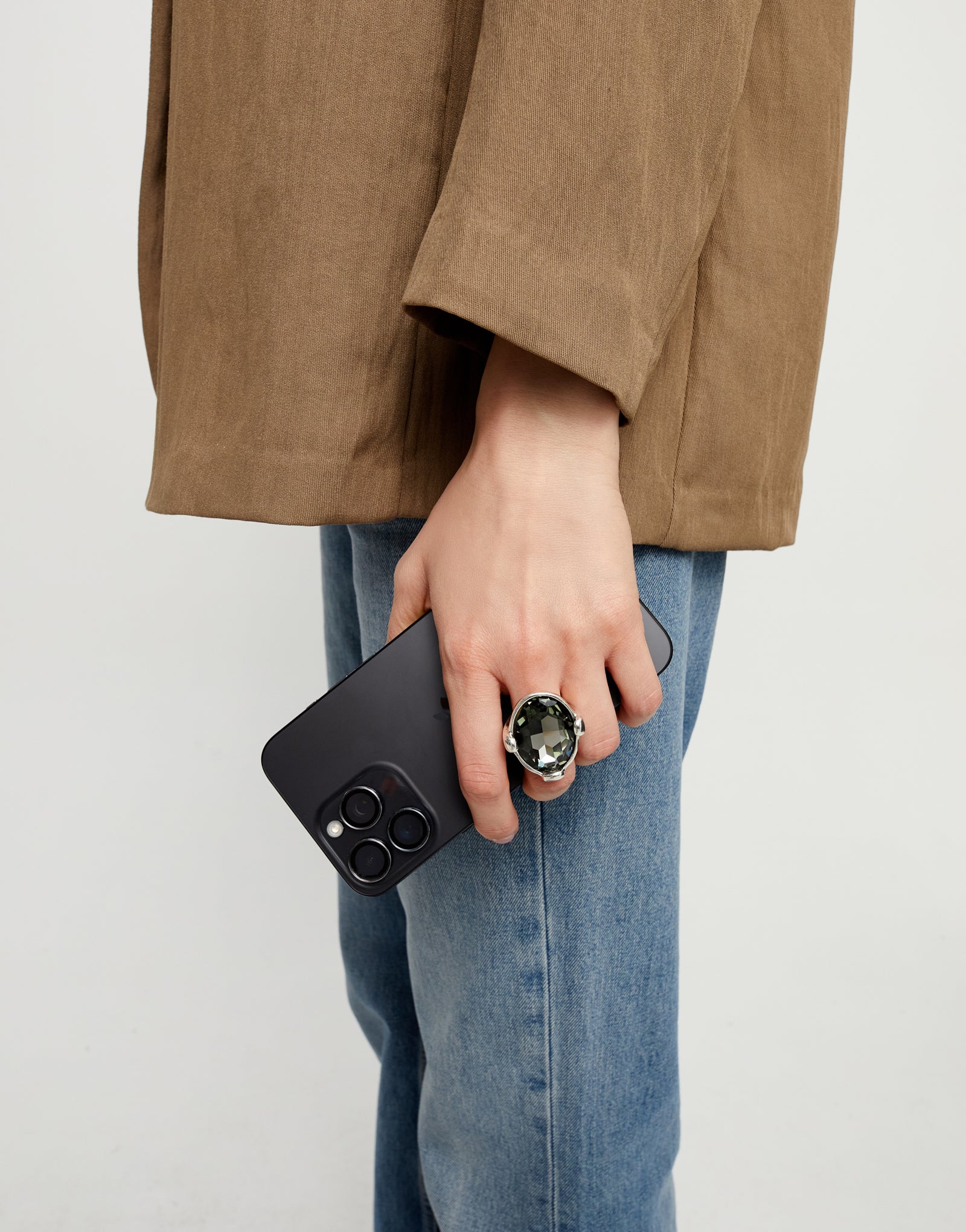 The large stone envelops the light with a subtle and magnetic glow, creating a powerful duality between the strength of the metal and the smoky subtlety of the crystal.