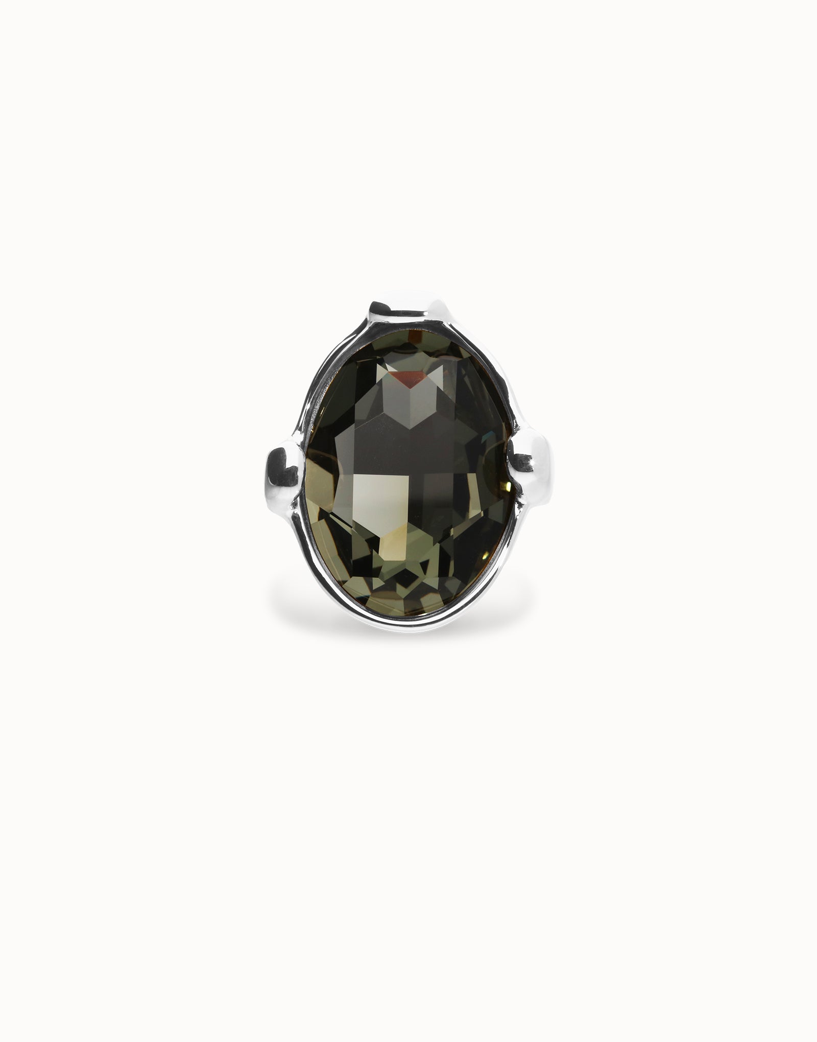 Large ring with gray oval faceted crystal