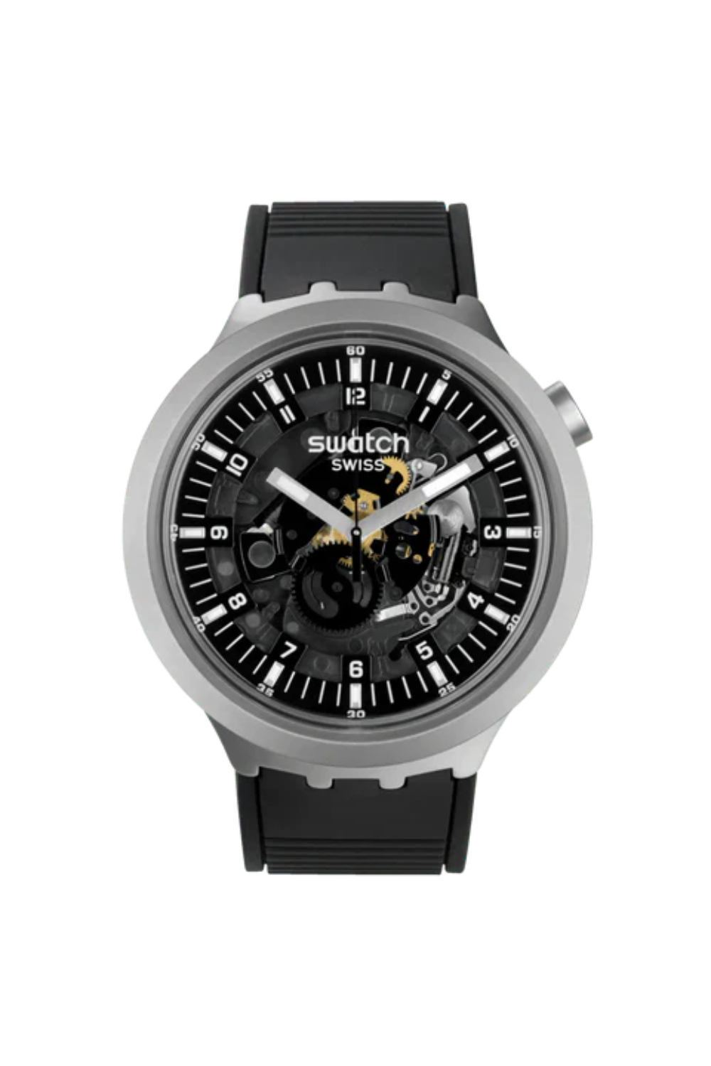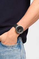 Este reloj de gran tamaño presenta una esfera abierta negra con manecillas que brillan en la oscuridad en una caja de metal arenado. Un reloj negro de esfera grande con una correa estructurada duradera y doble bucle.