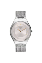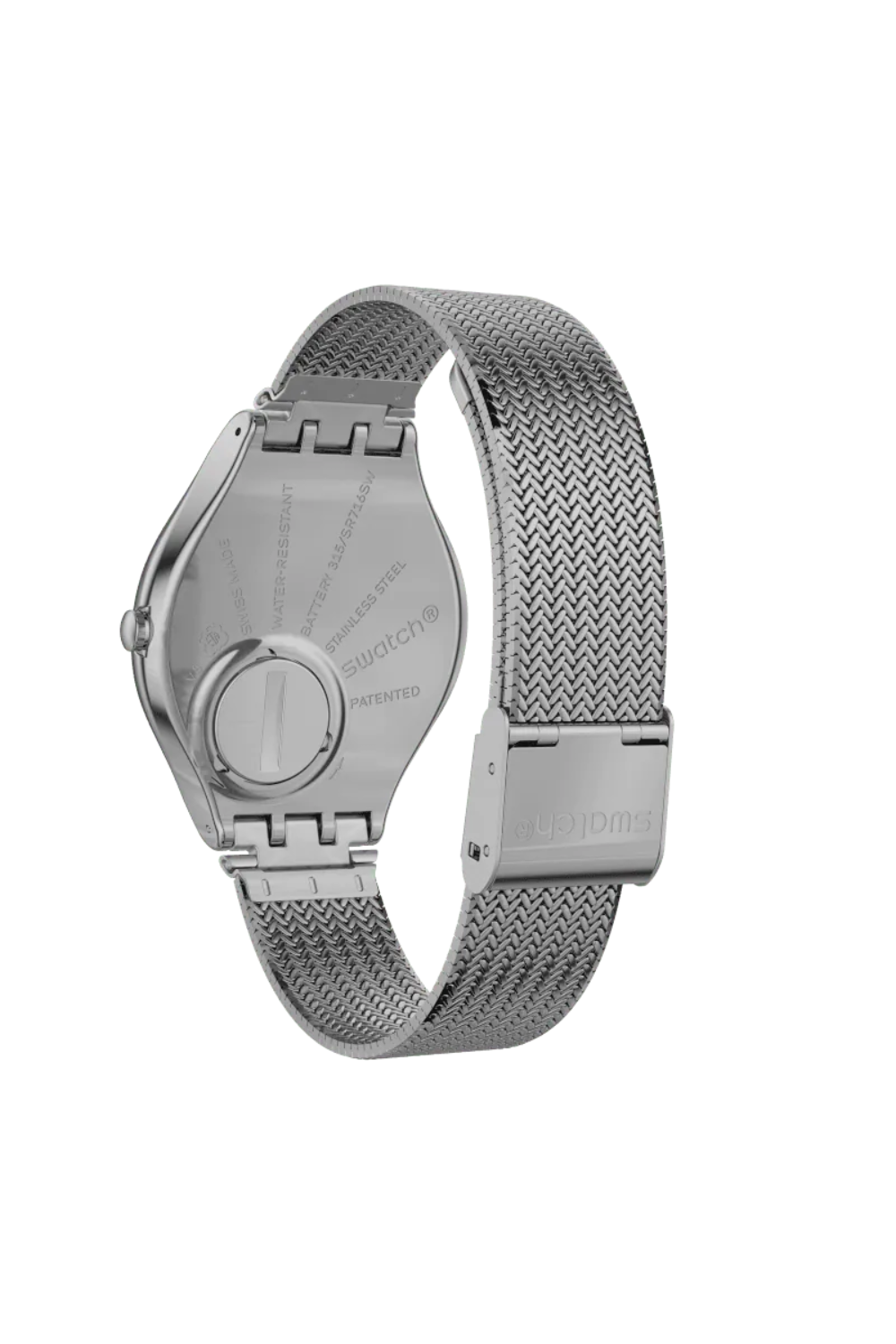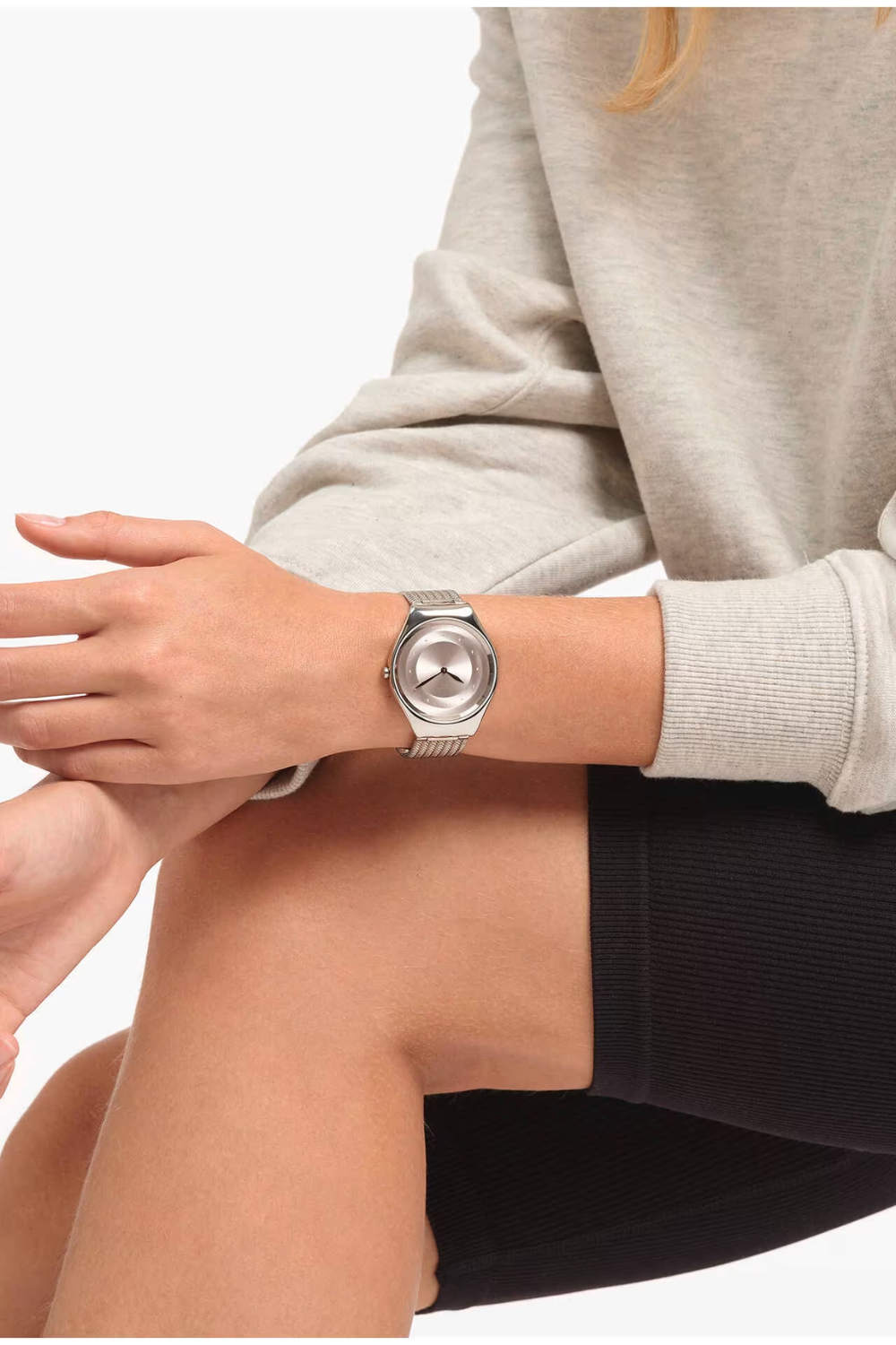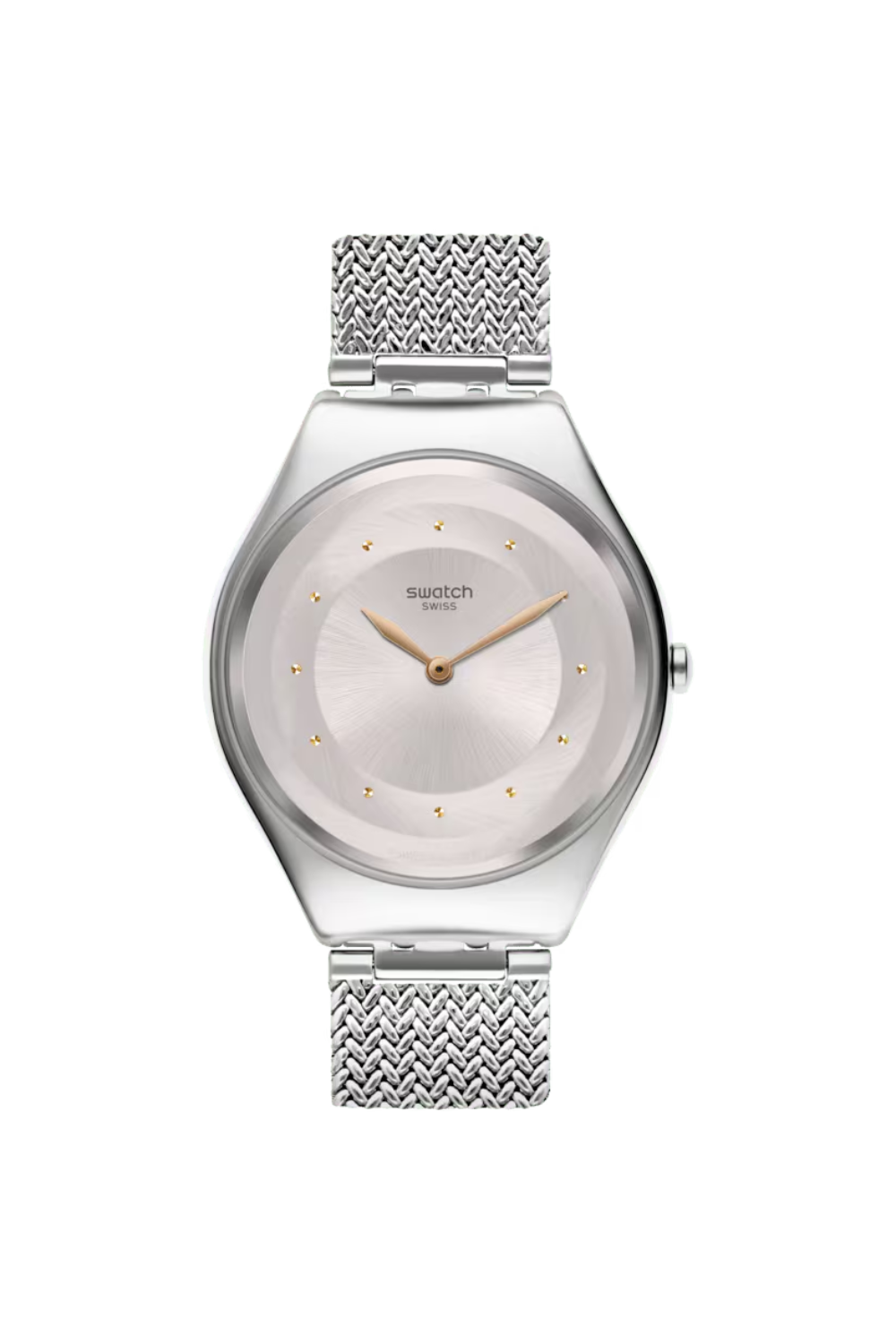 Suave como una playa de arena blanca, SKINSAND (SYXS117M) tiene una esfera beige brillante con un patrón cepillado multidireccional. SKINSAND se presenta con una pulsera milanesa.