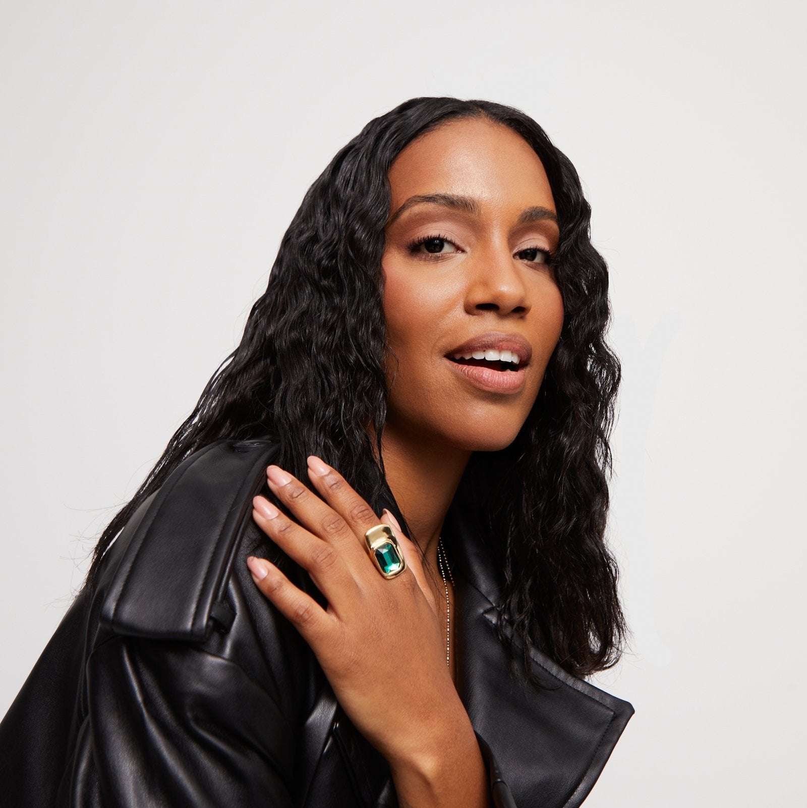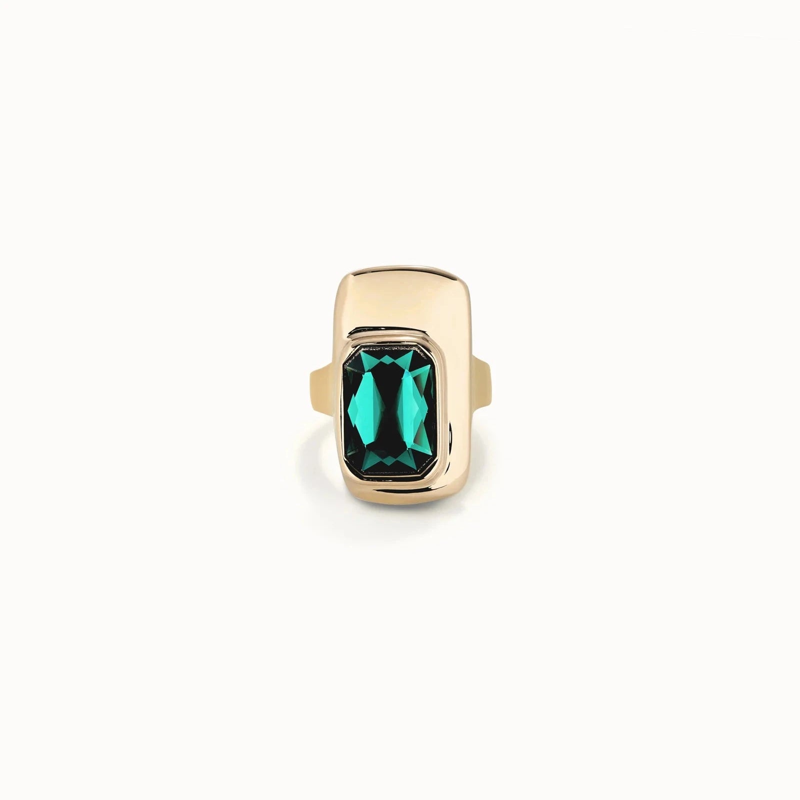 18K gold-plated ring with central faceted green crystal. Made in Spain with a 100% handmade process. These pieces of jewelry are an art exhibition composed of bracelets, rings, necklaces and earrings, where each piece is a work of art in which we find emerald style cut crystals and pieces with layers of geometric shapes. Discover the collection Ser Magnética.