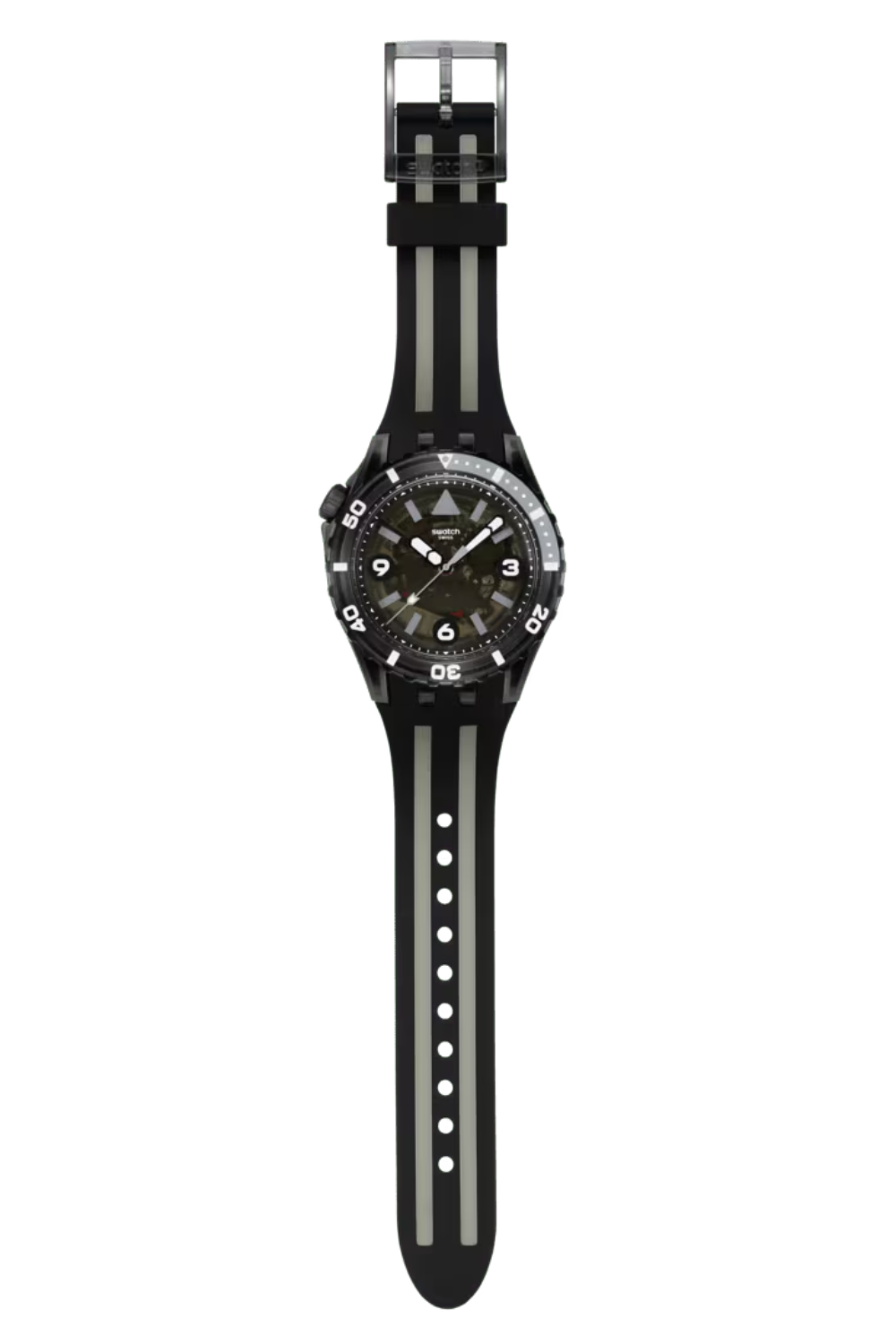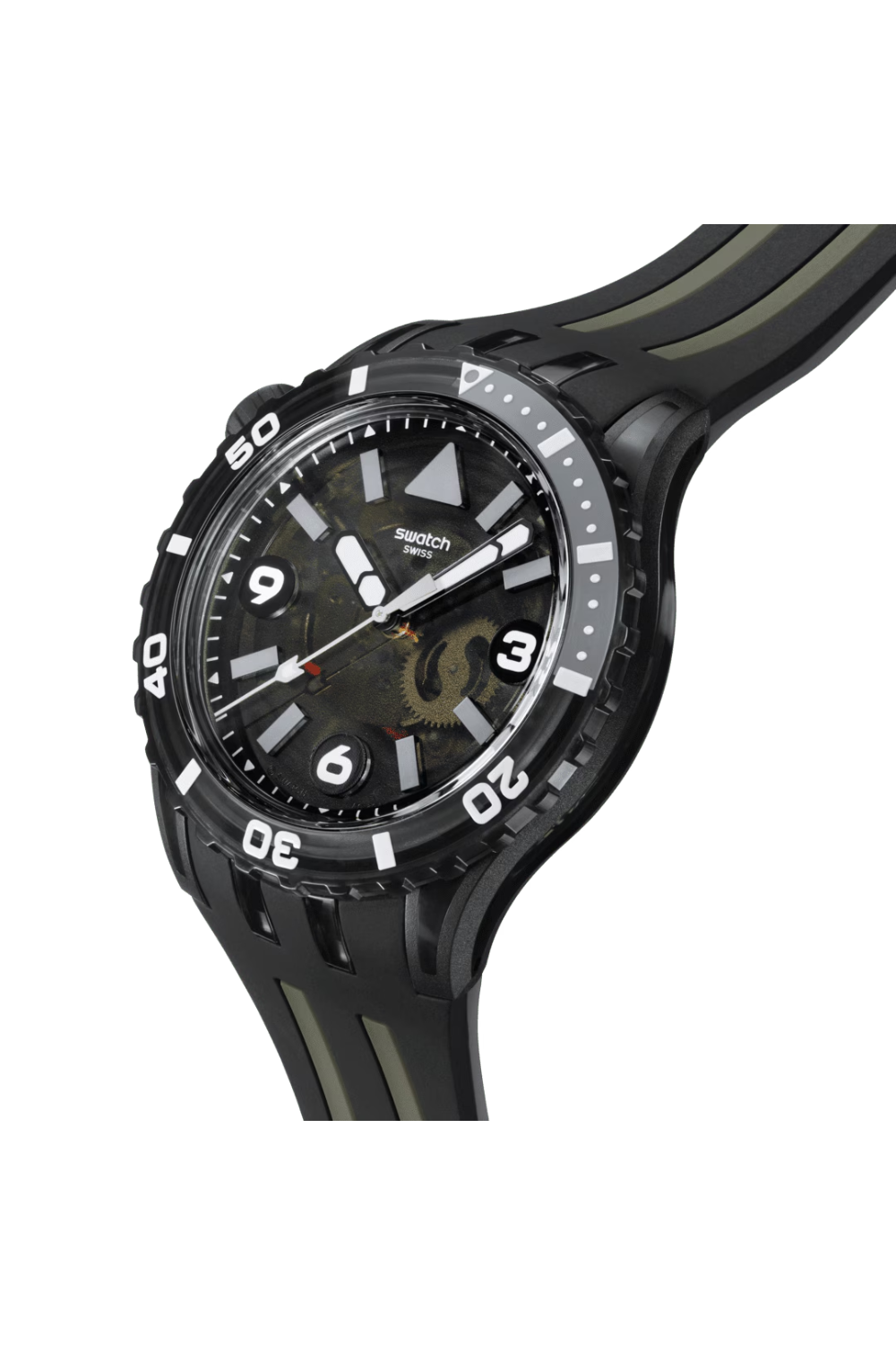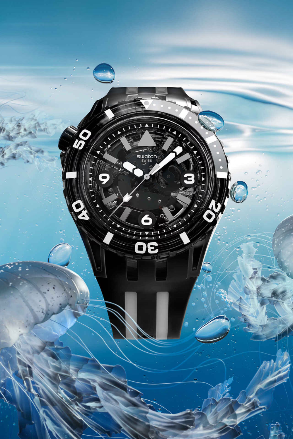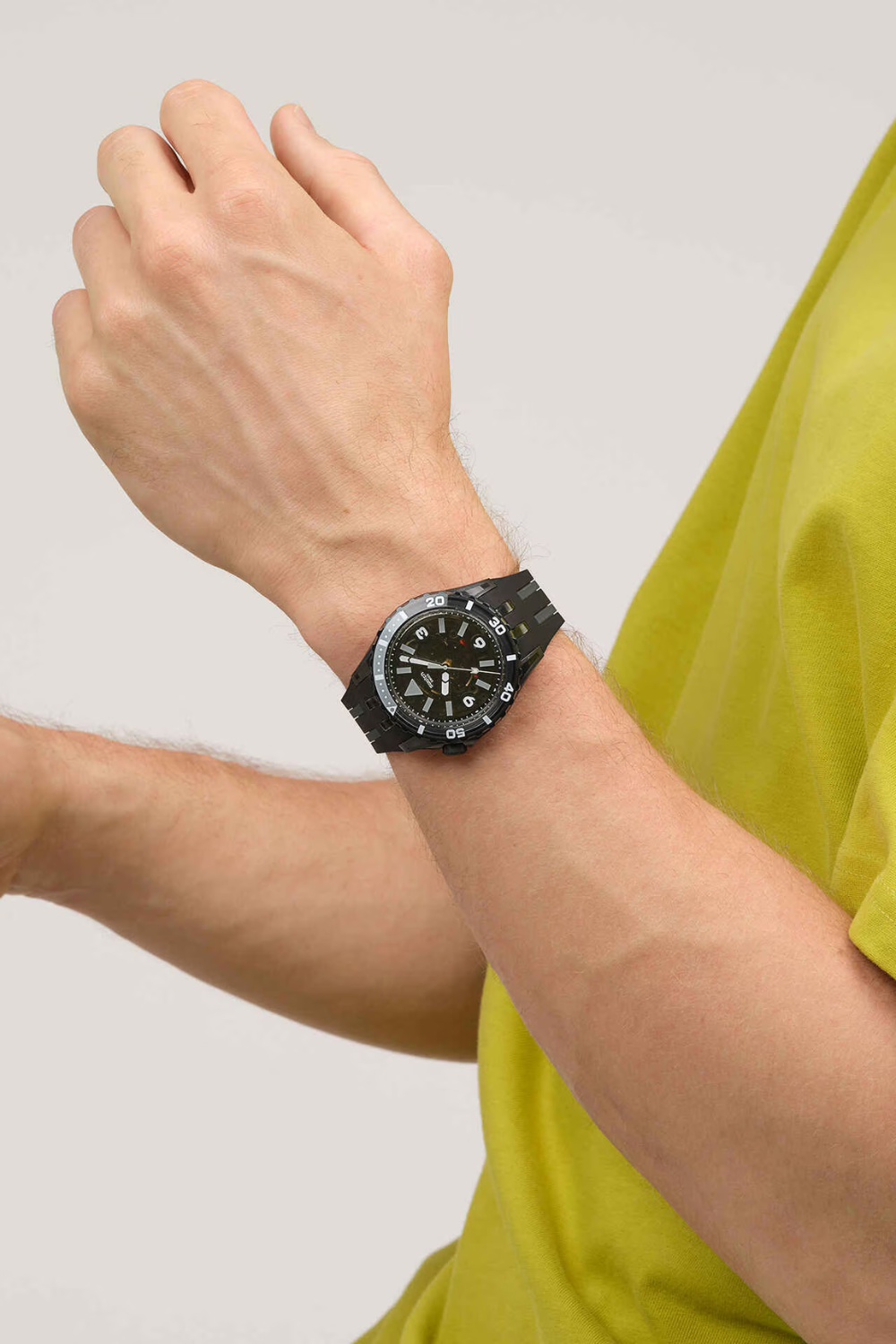 The transparent black dial of this diving watch features gray printed indexes, white printed numerals, black hour and minute hands, and a gray seconds hand, all with glow-in-the-dark effect, under biosourced glass. The case combines matte black Bioceramic and shiny transparent black biosourced material and is paired with a shiny transparent black biosourced bezel with gray and white print that glows in the dark and a matte black Bioceramic crown at 10 o'clock. A matte black and matte transparent black strap with a matte black loop and shiny, transparent black biosourced buckle complete the watch.