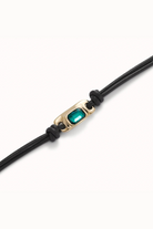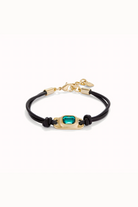 18K gold-plated black leather bracelet with central faceted green crystal. Made in Spain with a 100% handmade process.These pieces of jewelry are an art exhibition composed of bracelets, rings, necklaces and earrings, where each piece is a work of art in which we find emerald style cut crystals and pieces with layers of geometric shapes. Discover the collection ser magnética.