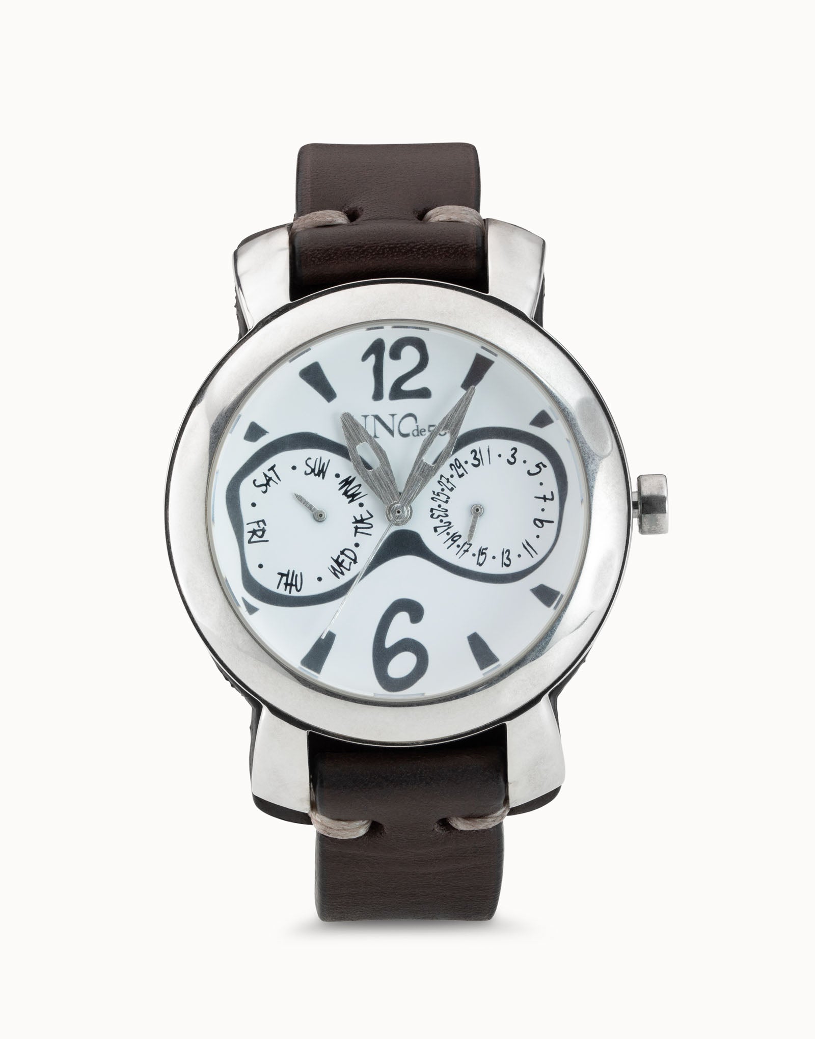 Unisex leather watch with round case in silver-plated metal alloy, handcarved. Watch design on the face and Quartz movement. Mineral crystal and handmade adjustable watchband.