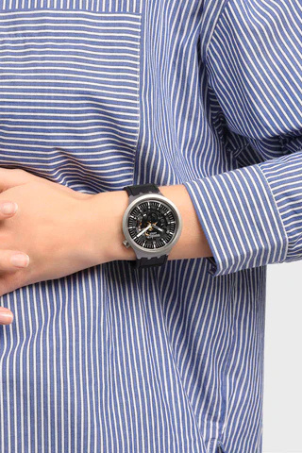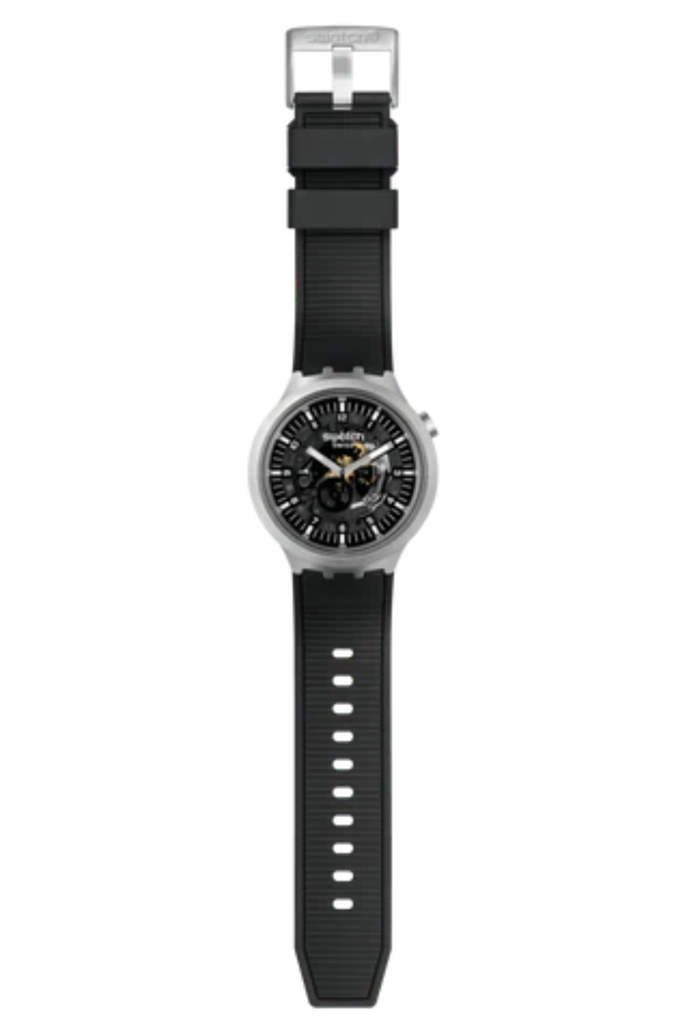 Este reloj de gran tamaño presenta una esfera abierta negra con manecillas que brillan en la oscuridad en una caja de metal arenado. Un reloj negro de esfera grande con una correa estructurada duradera y doble bucle.