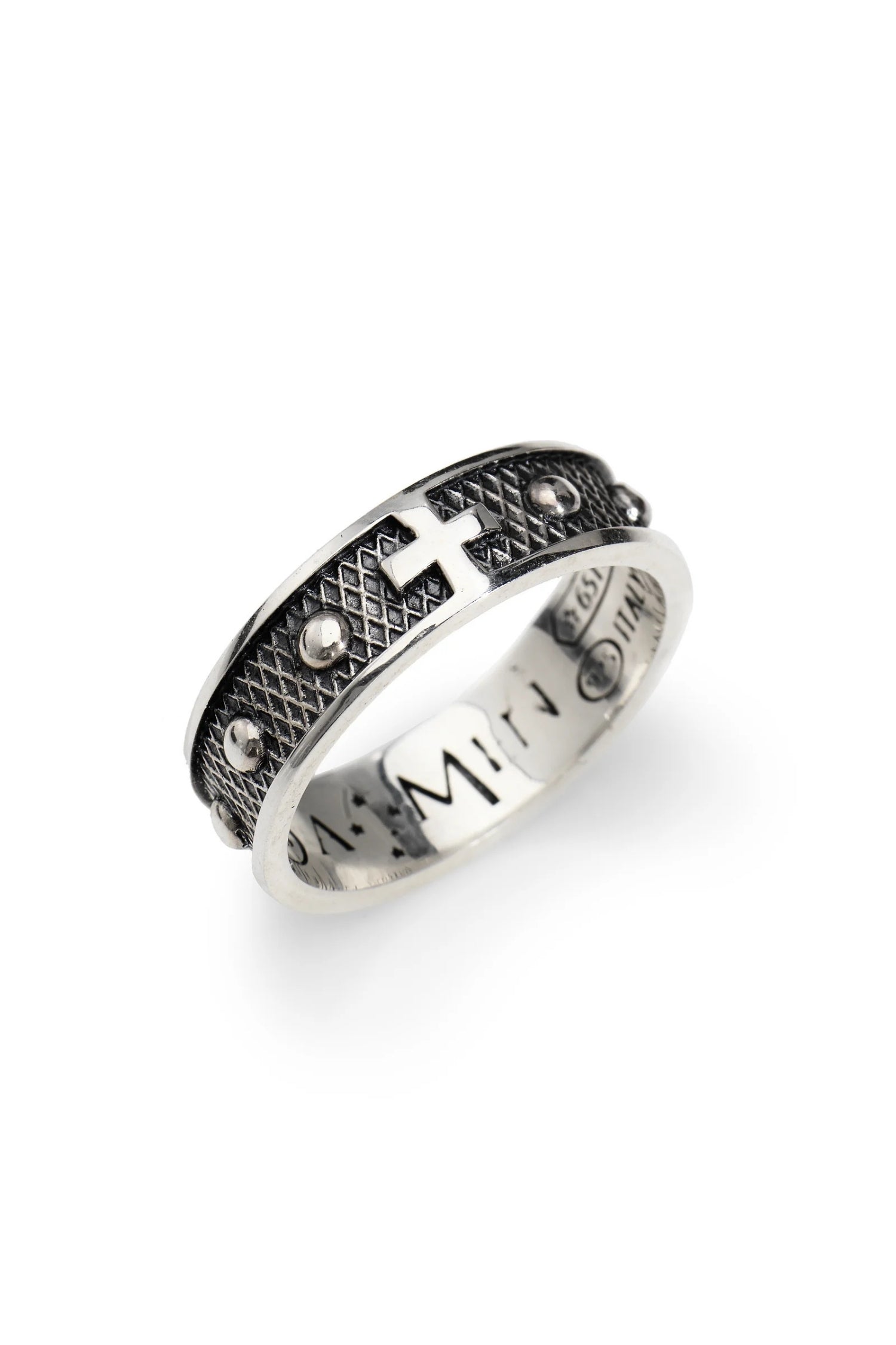 Rosary ring in burnished finished sterling silver featuring a cross and a decade of the Rosary.