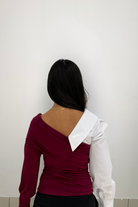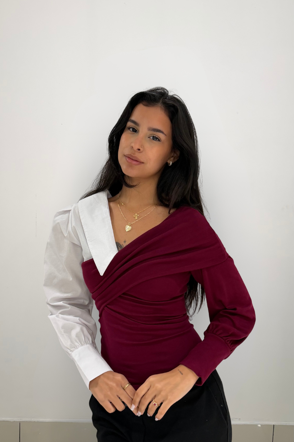 This blouse features an elegant off-the-shoulder design with a layered, asymmetrical neckline. It combines a deep burgundy fabric with a contrasting white inner layer, creating a sophisticated two-tone look