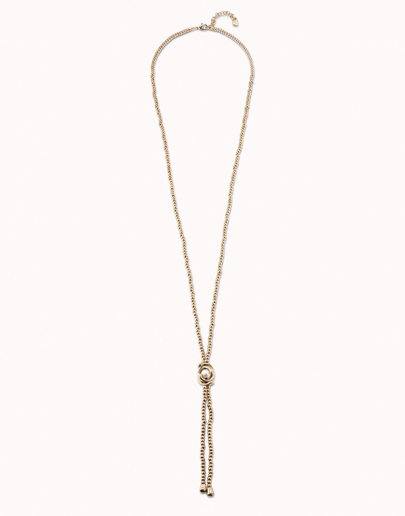 The Little Moon necklace is a whip-shaped design featuring a dual moon pendant with a small central pearl. It is entirely handmade in Spain using an exclusive gold-plated metal alloy. The clasp allows the necklace to be adjusted to the desired length and it weighs 37.6 g. Wear it with the rest of the pieces from the collection to get the latest look with stylish jewelry.