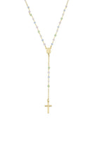 Yellow gold-plated classic rosary Y-necklace with 3 mm multifaceted pink, light blue, and green crystals and white crystal pearls, featuring cross and Miraculous Mary medal. Necklace length can be adjusted from 48 to 50 cm with lobster clasp and extension chain links.