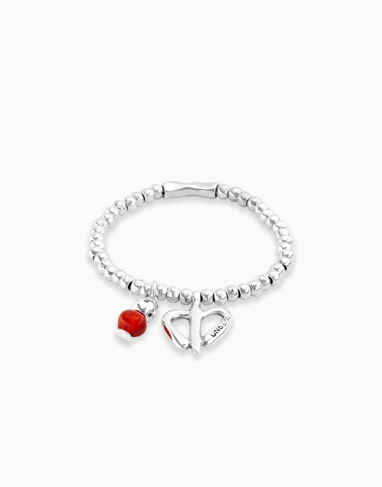 Sencilla pulsera elástica, formada por múltiples abalorios circulares en metal bañado en plata y con dos charms, uno en color rojo y el otro en forma de corazón.