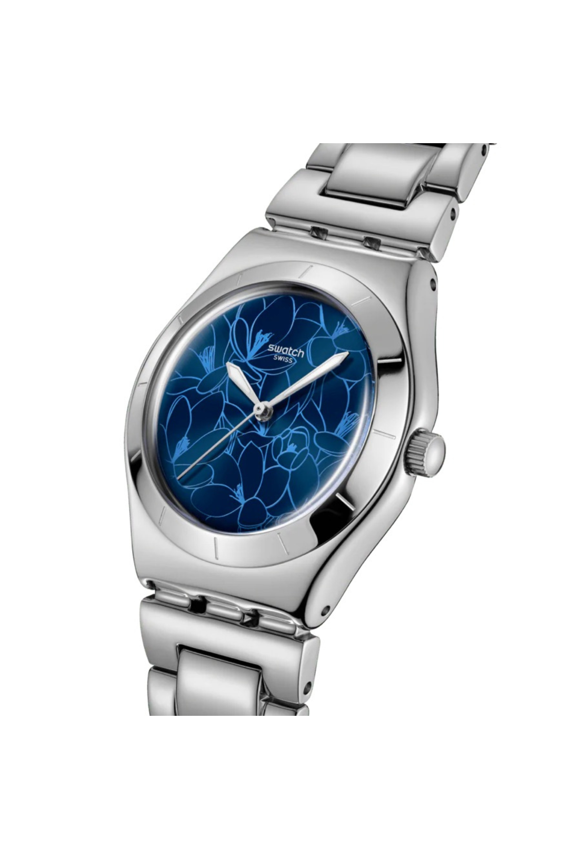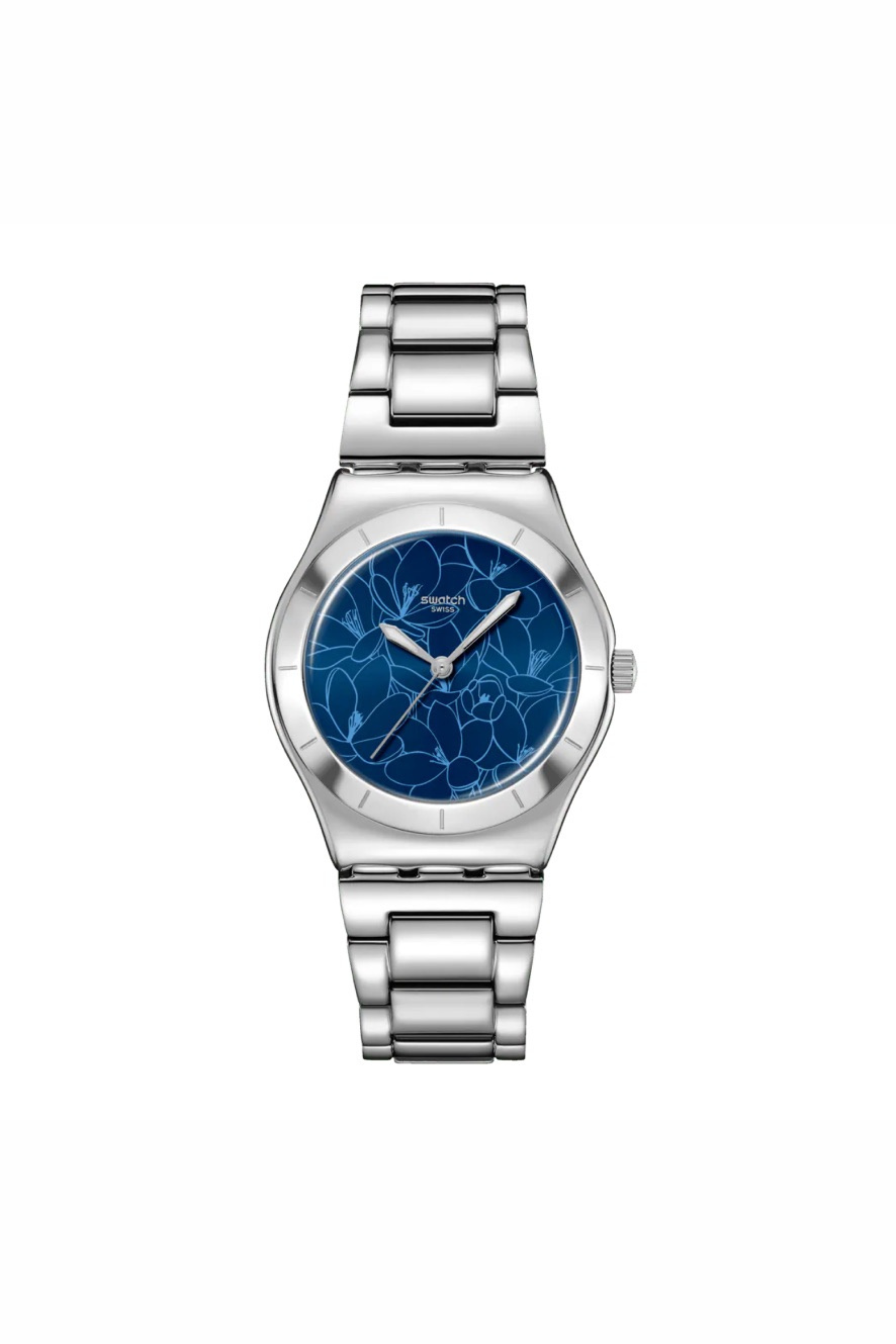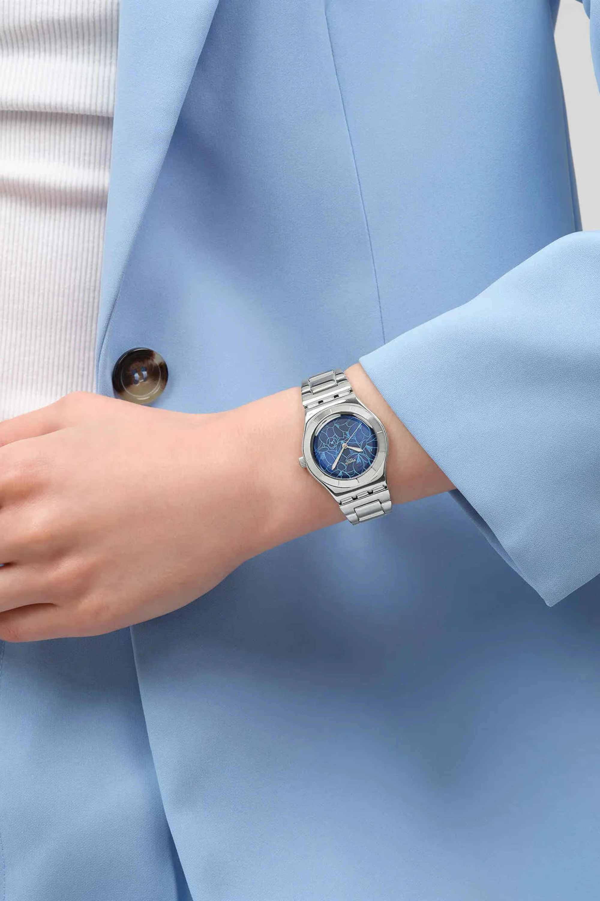 This sleek, stainless steel timepiece features a blue sun-brushed dial with a printed light blue floral pattern, silver-colored hour and minute hands with glow-in-the-dark effect and a silver-colored seconds hand. The watch has a polished stainless steel case and matching bezel with engraved hour markers. A polished stainless steel bracelet with butterfly buckle finishes the look.