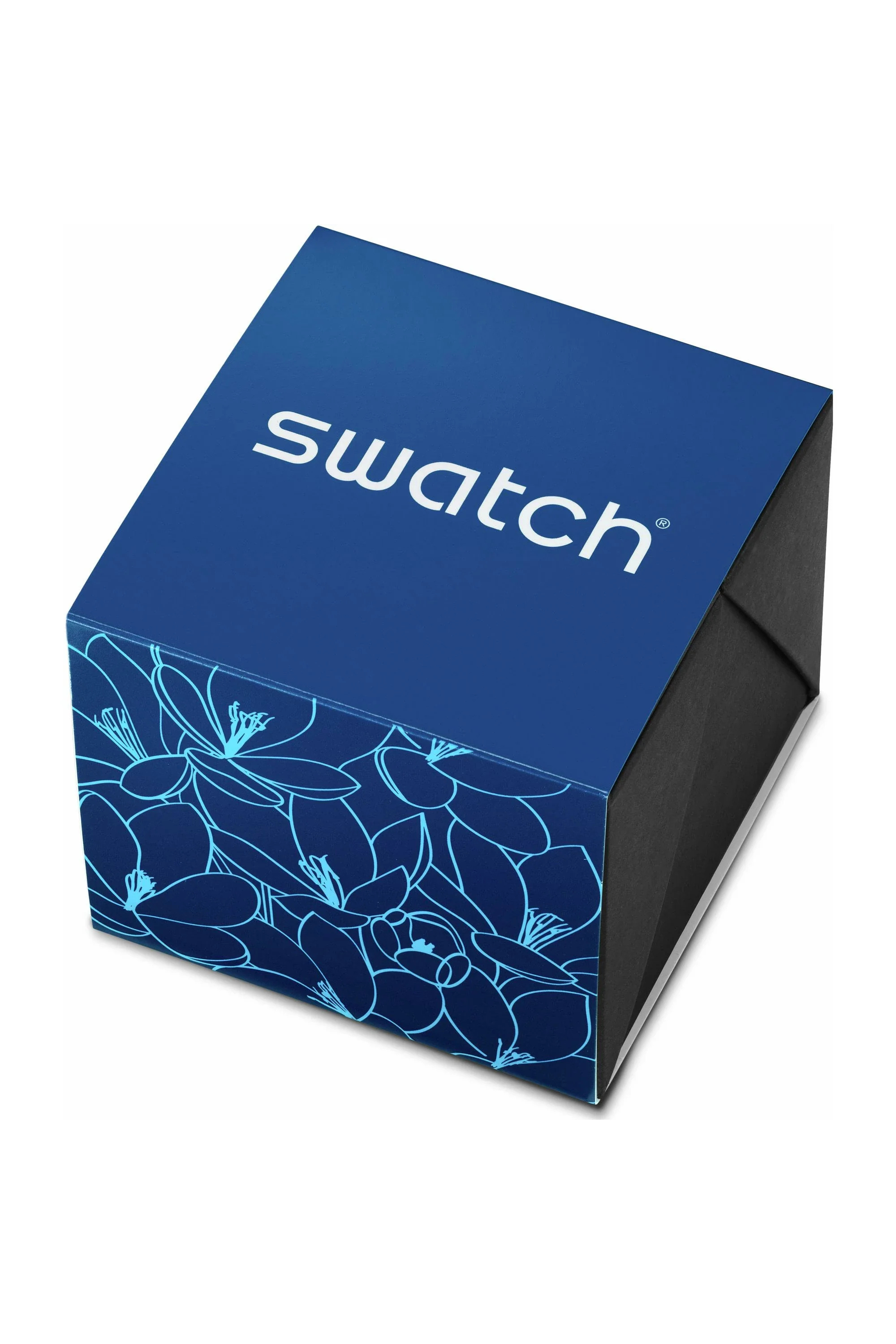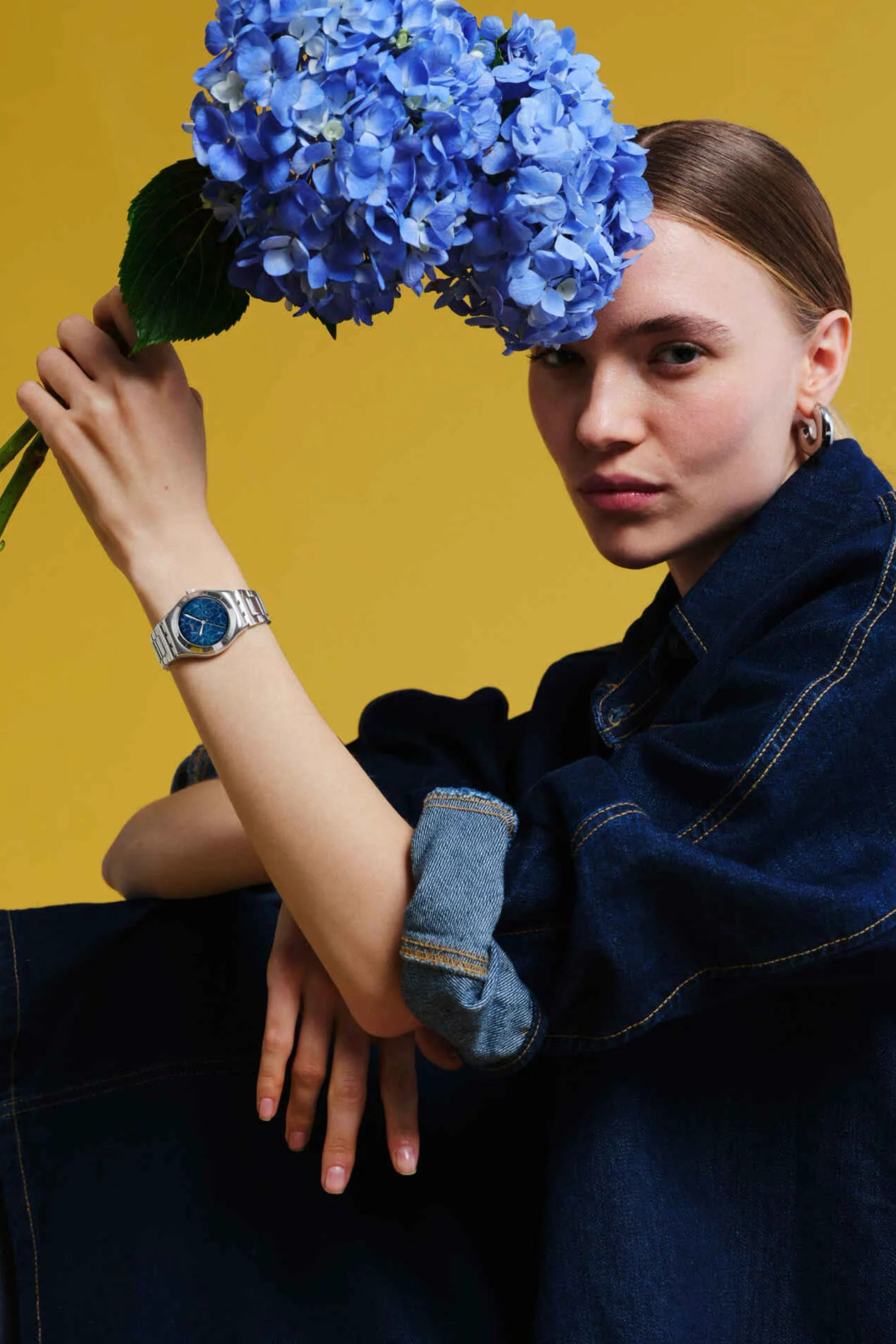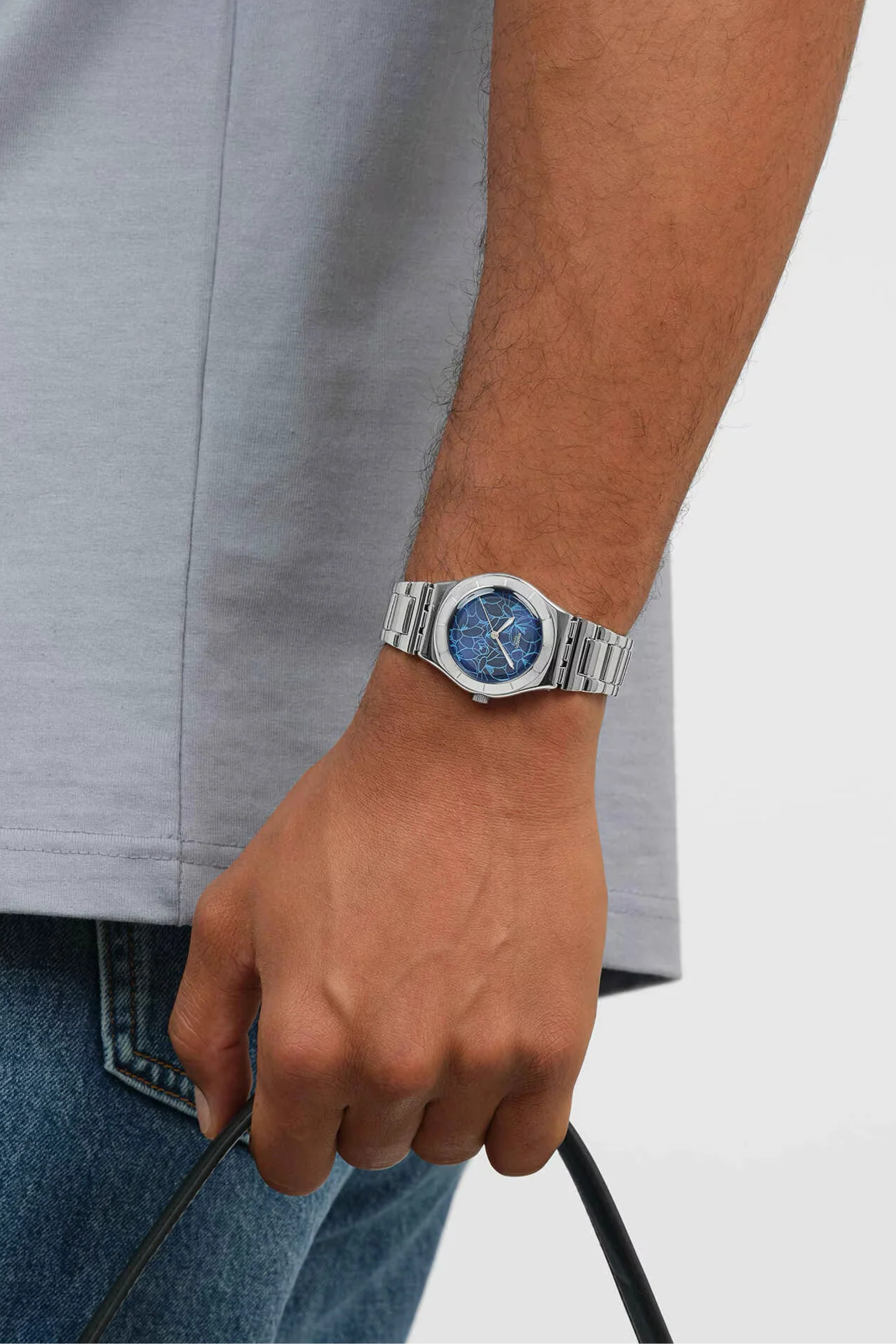 This sleek, stainless steel timepiece features a blue sun-brushed dial with a printed light blue floral pattern, silver-colored hour and minute hands with glow-in-the-dark effect and a silver-colored seconds hand. The watch has a polished stainless steel case and matching bezel with engraved hour markers. A polished stainless steel bracelet with butterfly buckle finishes the look.