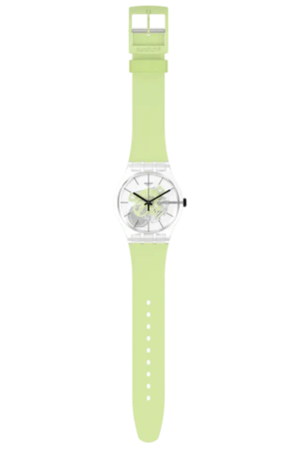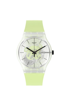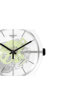 This crisp green watch will bring a spring feel to any look. It features a transparent matte bio-sourced case and a matte silicone strap with a light green print. The clear case with a semi-transparent white print, black print and light green movement elements creates alluring depth.