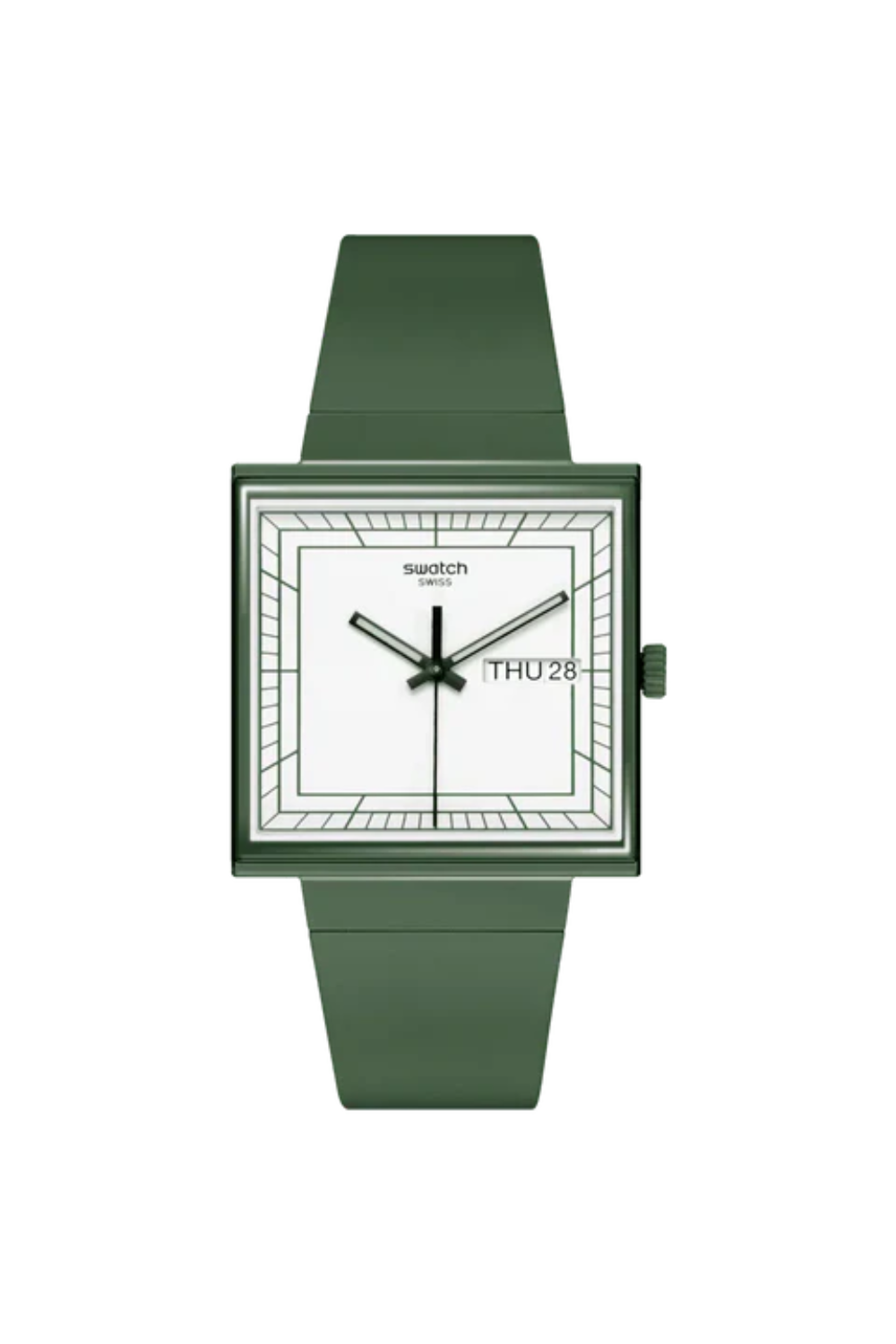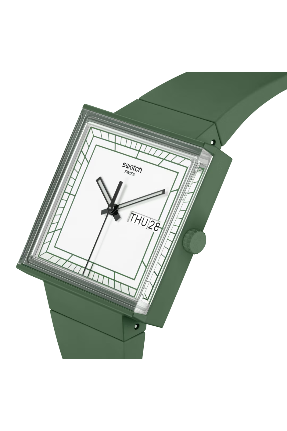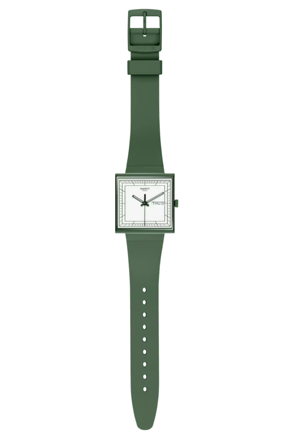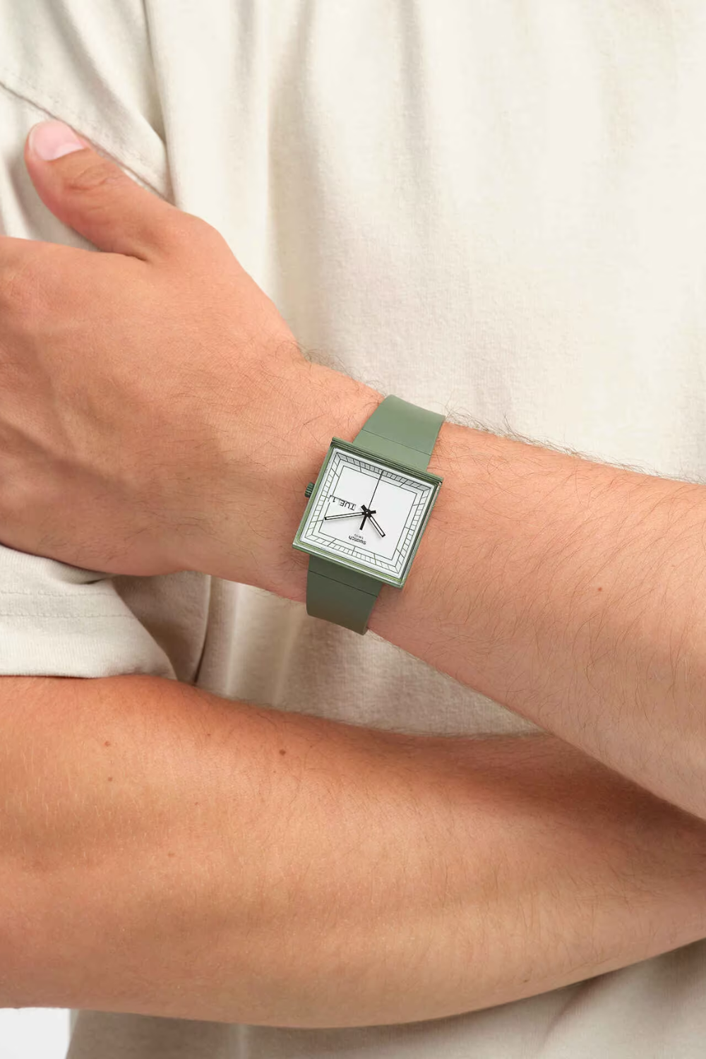 The square BIOCERAMIC watch case features edge-to-edge biosourced glass that gives a side view of the watch’s indexes. The square dial has glow-in-the-dark hands and a day-date window at 3 o'clock. The dial is complemented by an integrated biosourced strap. A printed battery cover on the back depicts one of the watch faces that inspired this green, square watch.