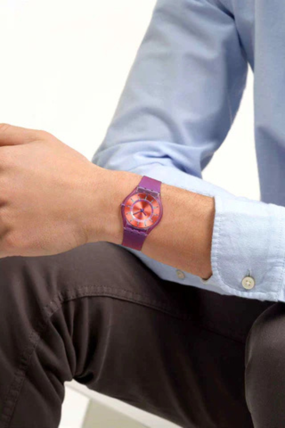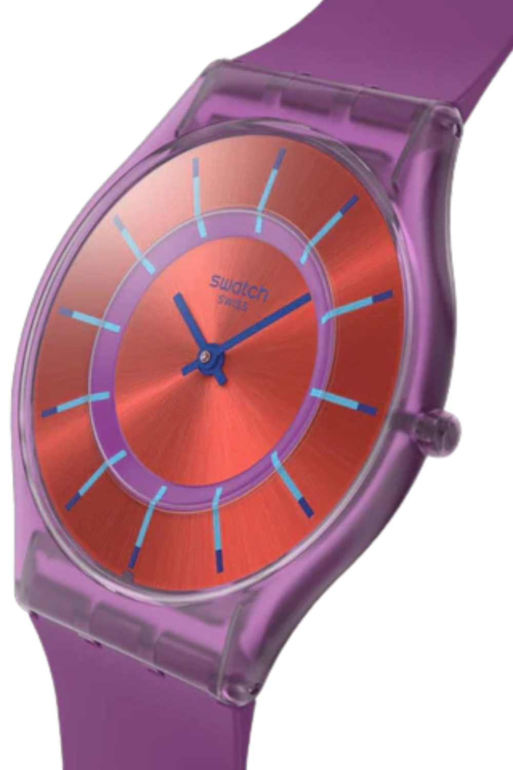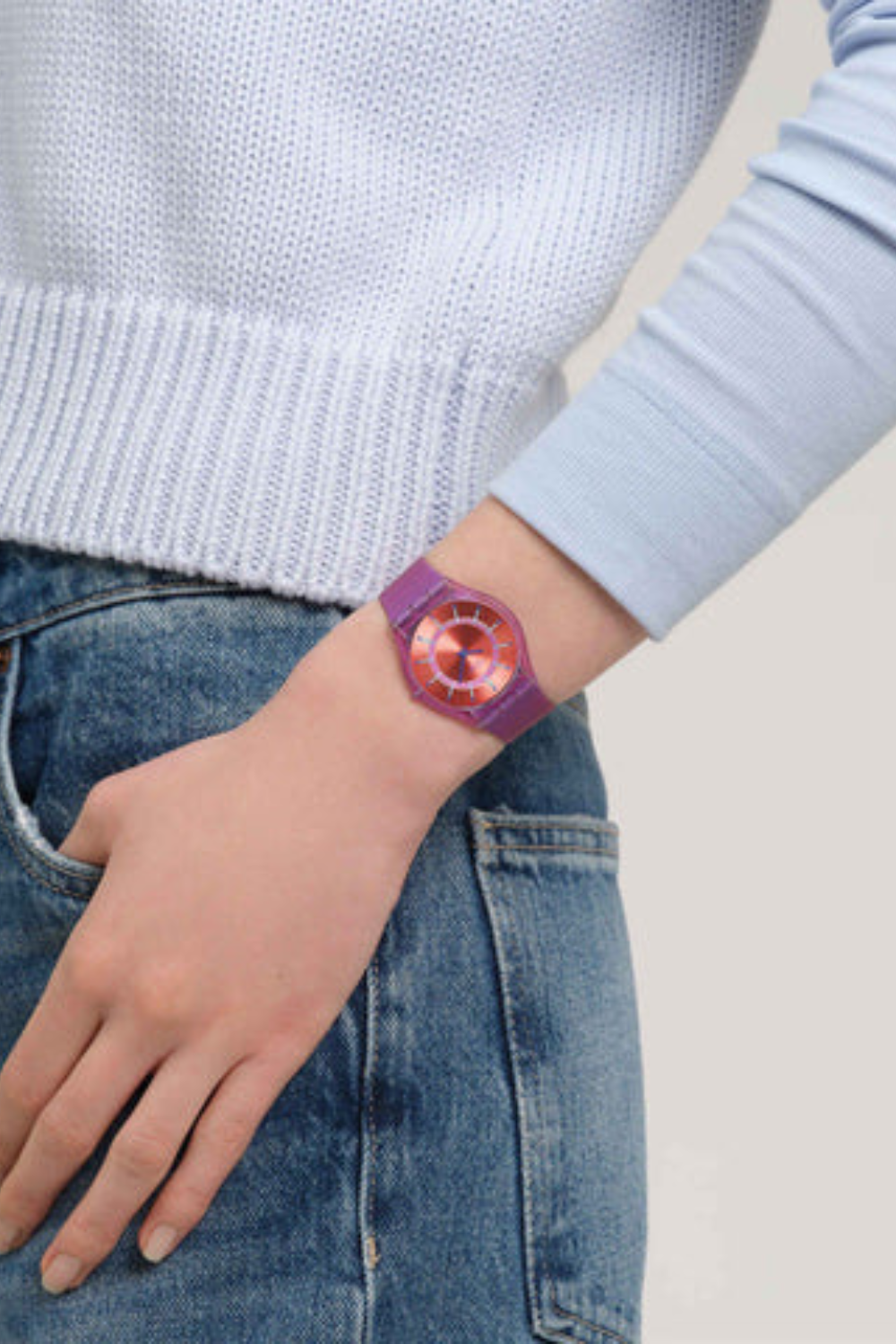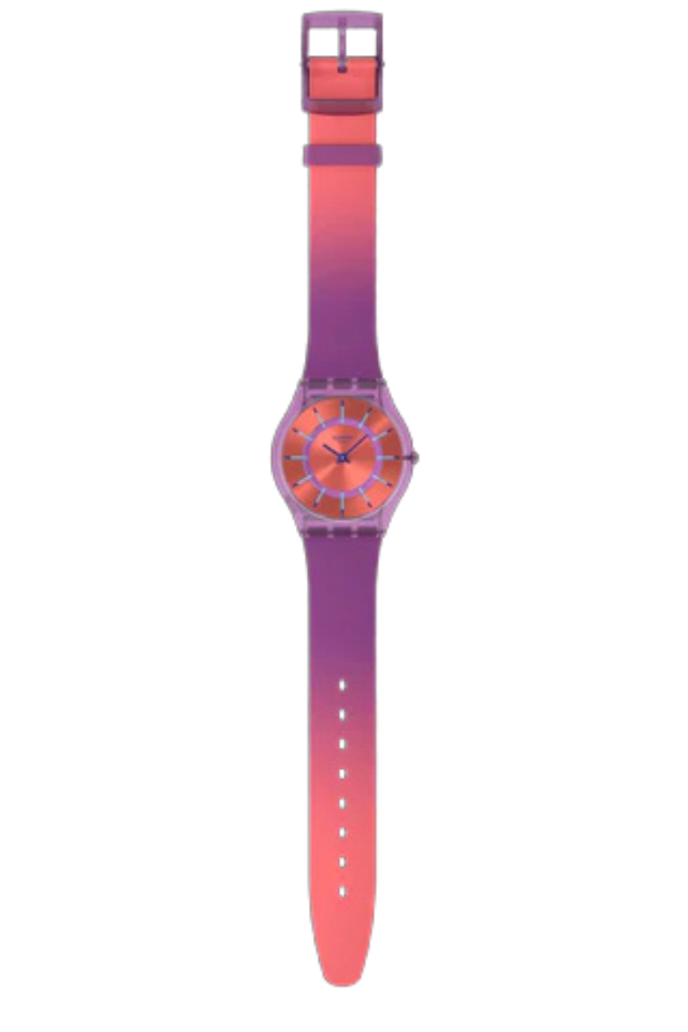 This ultra-slim watch sports a dark pink sun-brushed dial with a purple printed inner ring, dual-toned light blue and dark blue hour markers and dark blue hour and minute hands all under biosourced glass. The matte transparent purple case is paired with a matte, gradient purple and dark pink strap, matte transparent purple loop and matte transparent purple buckle.